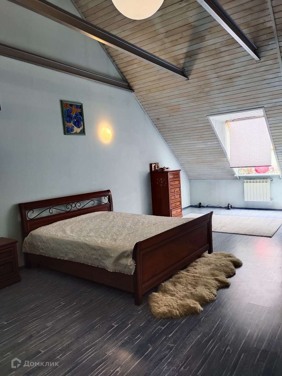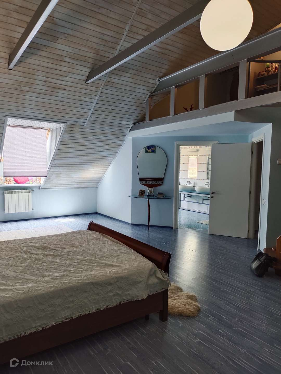 На мансарде расположена просторная спальная зона с санузлом, гардеробной и небольшой студией. Есть также небольшая спальная комната отдельно.