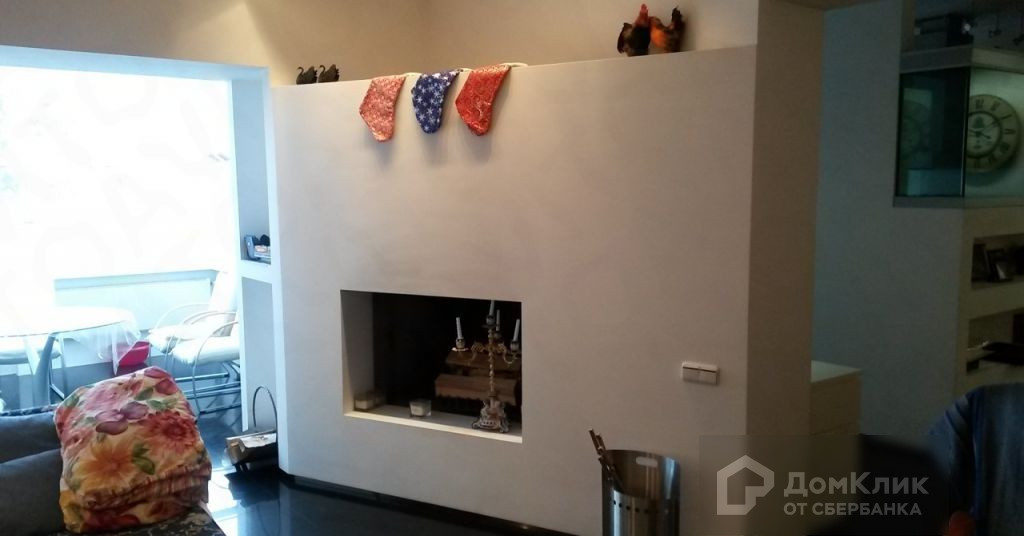На первом этаже: гостиная с камином и кухня.
