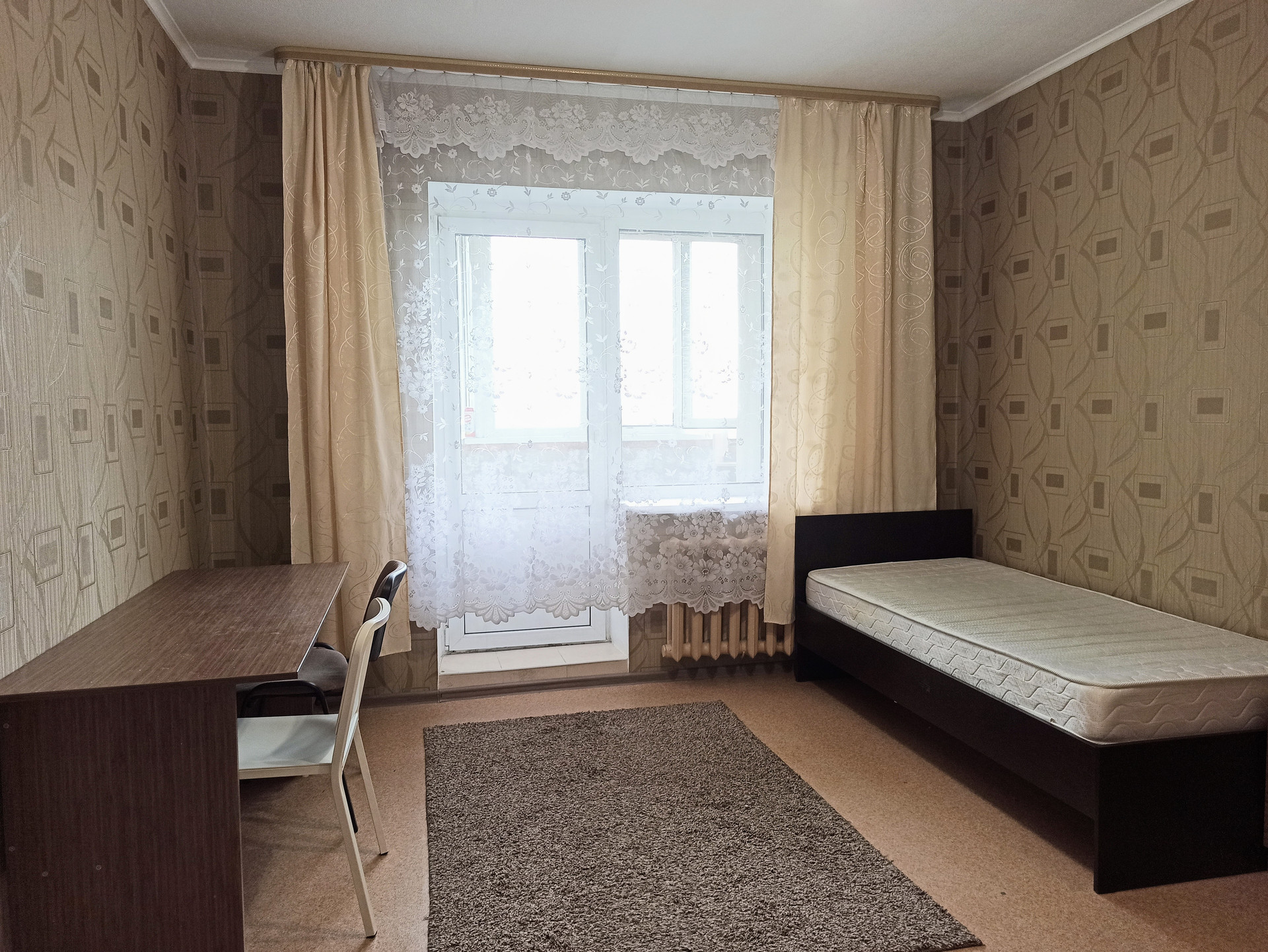 Комната — 17,22 кв.м. В комнате вся необходимая мебель. Шкаф, кровать с матрасом, тумбочка, стол, комод, стулья. Окно комнаты выходит на юго-восток.