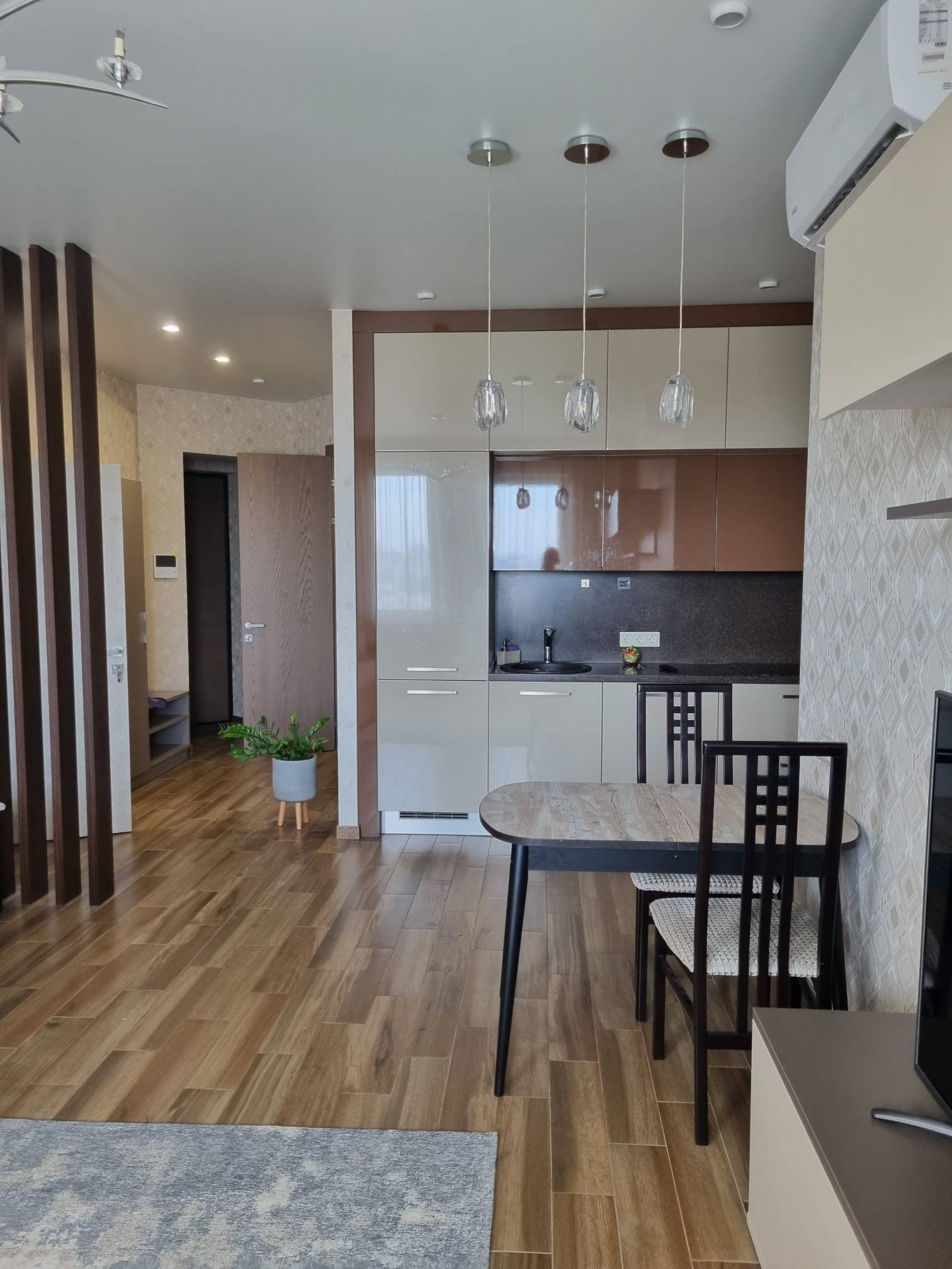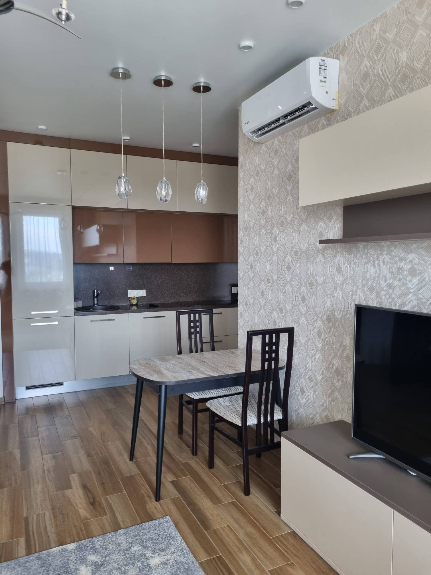предлагается в аренду прекрасную квартиру, по планировке евродвушка, гостиная с раскладывающимся диваном, кондиционером, встроенной кухней, из техники на кухне варочная панель, духовой шкаф, посудомоечная машина, холодильник, уютная спальня с двуспальной кроватью, комодом и вместительным встроенным шкафом, большая веранда и завораживающий вид на город, залог можно разбить на 2 платежа
