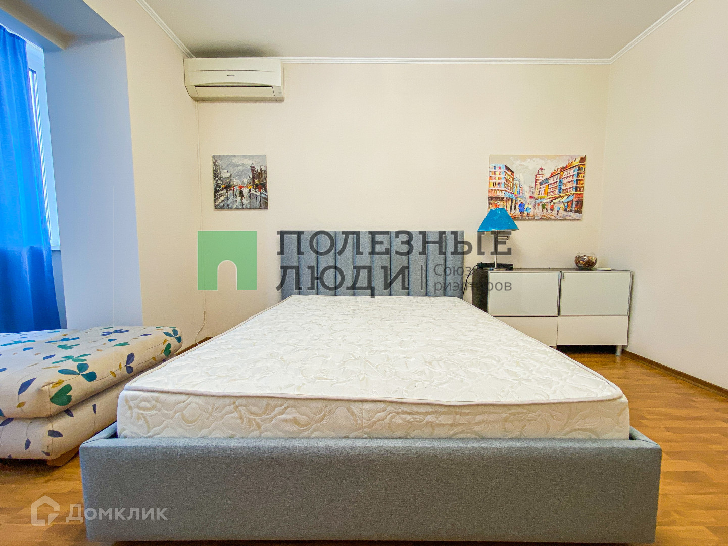 В комнате установлена полноразмерная кровать, кондиционер, кресло, телевизор;