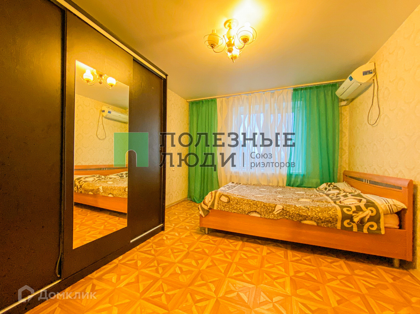 В спальной вместительный шкаф, кровать и кондиционер;