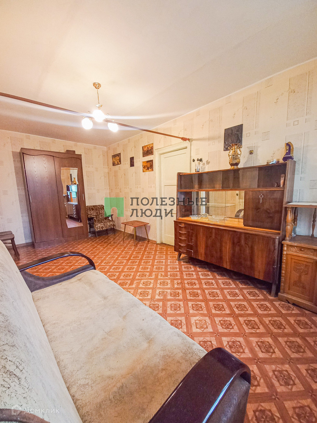 -Первая комната с большим двуспальным pаcклaдывающимся диваном, креслом, журнальным столиком, шкафом, стенкой и телевизором.