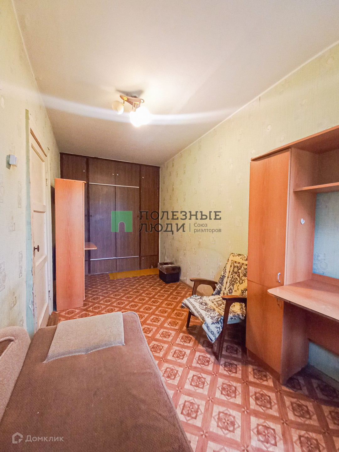 -Вторая комната с раскладывающим диваном, креслом, вместительным шкафом и двумя рабочими местами.