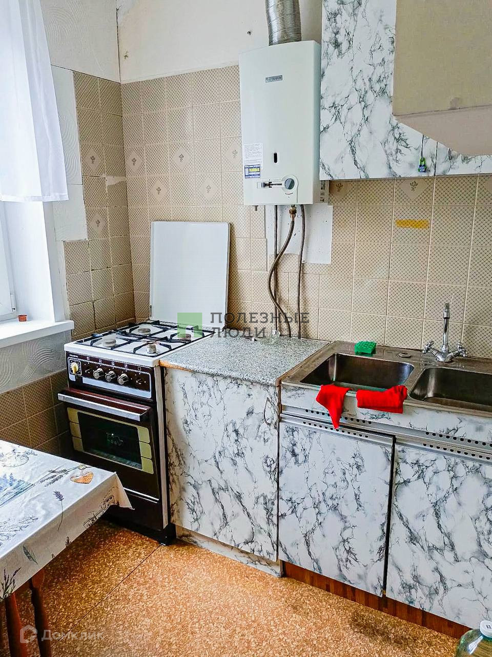 -Кухонная зона со всей необходимой техникой (газовая плита, духовой шкаф, газовая колонка, СВЧ-печь). Холодильника нет, при необходимости можно приобрести в счет аренды.