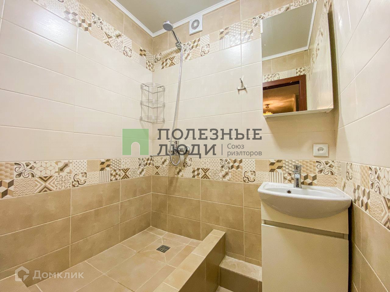 -Санузел раздельный с душем, раковиной и шкафчиком с зеркалом.