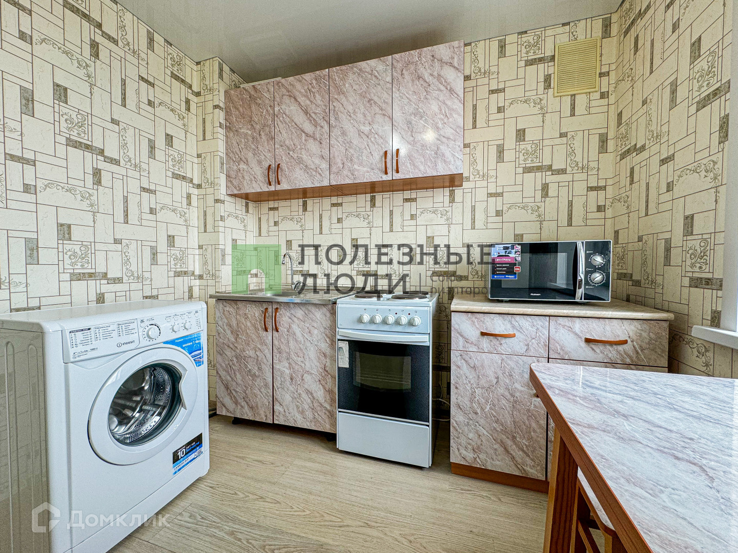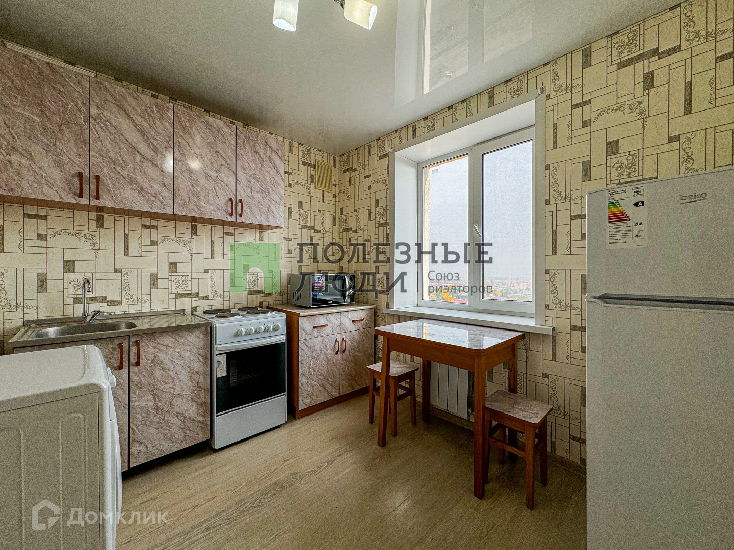 -Кухонная зона со всей необходимой техникой. (Холодильник, духовой шкаф, электрическая плита, СВЧ-печь)