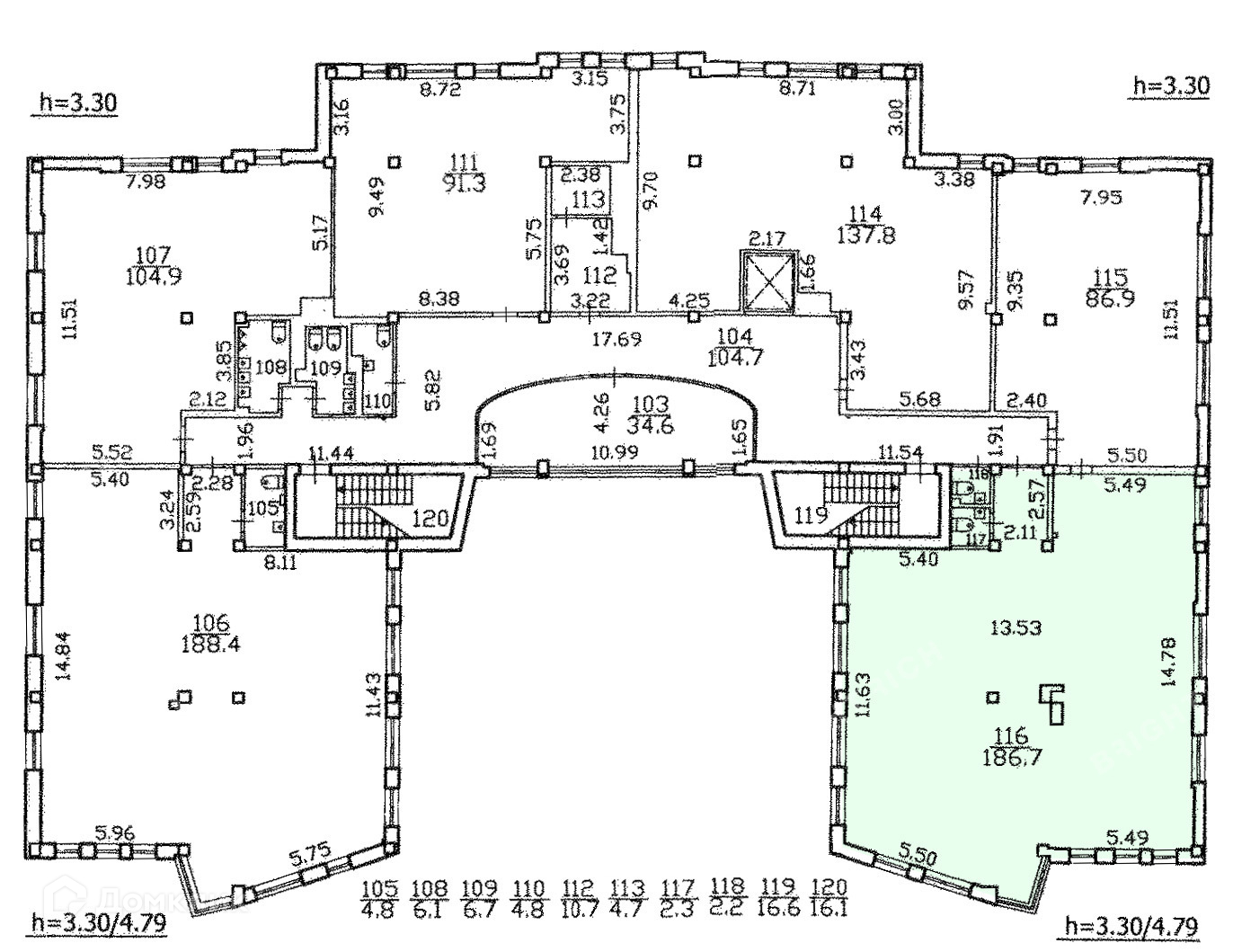 - Высота потолков: 2.6 м, 3.3 м, 4 м;