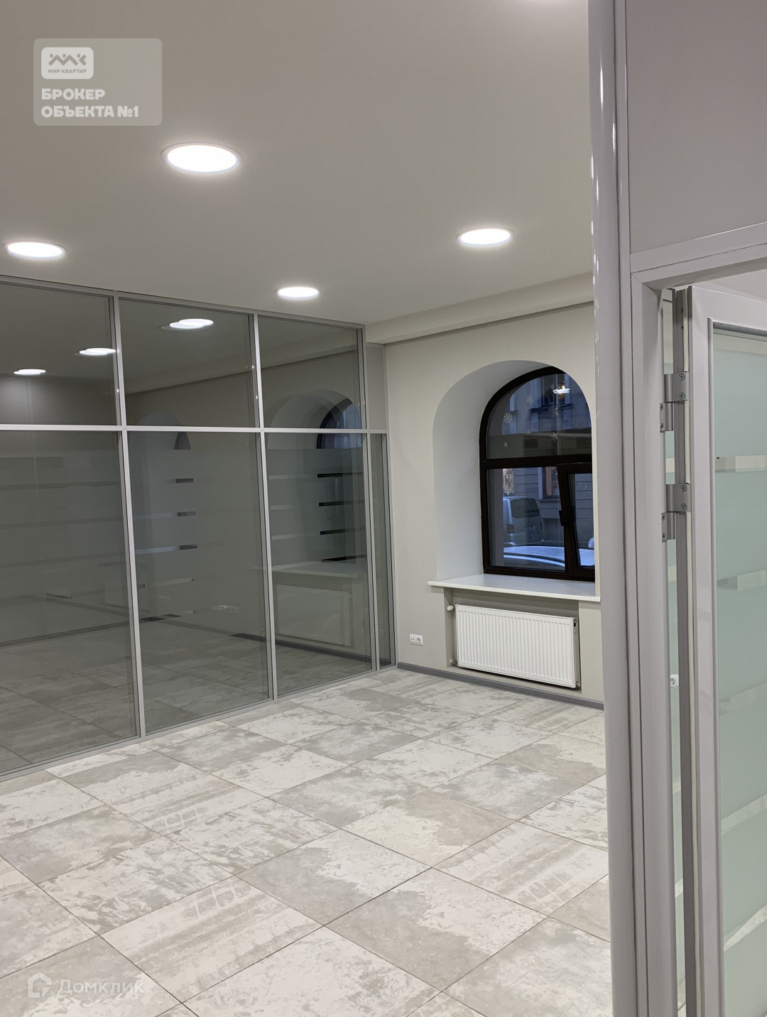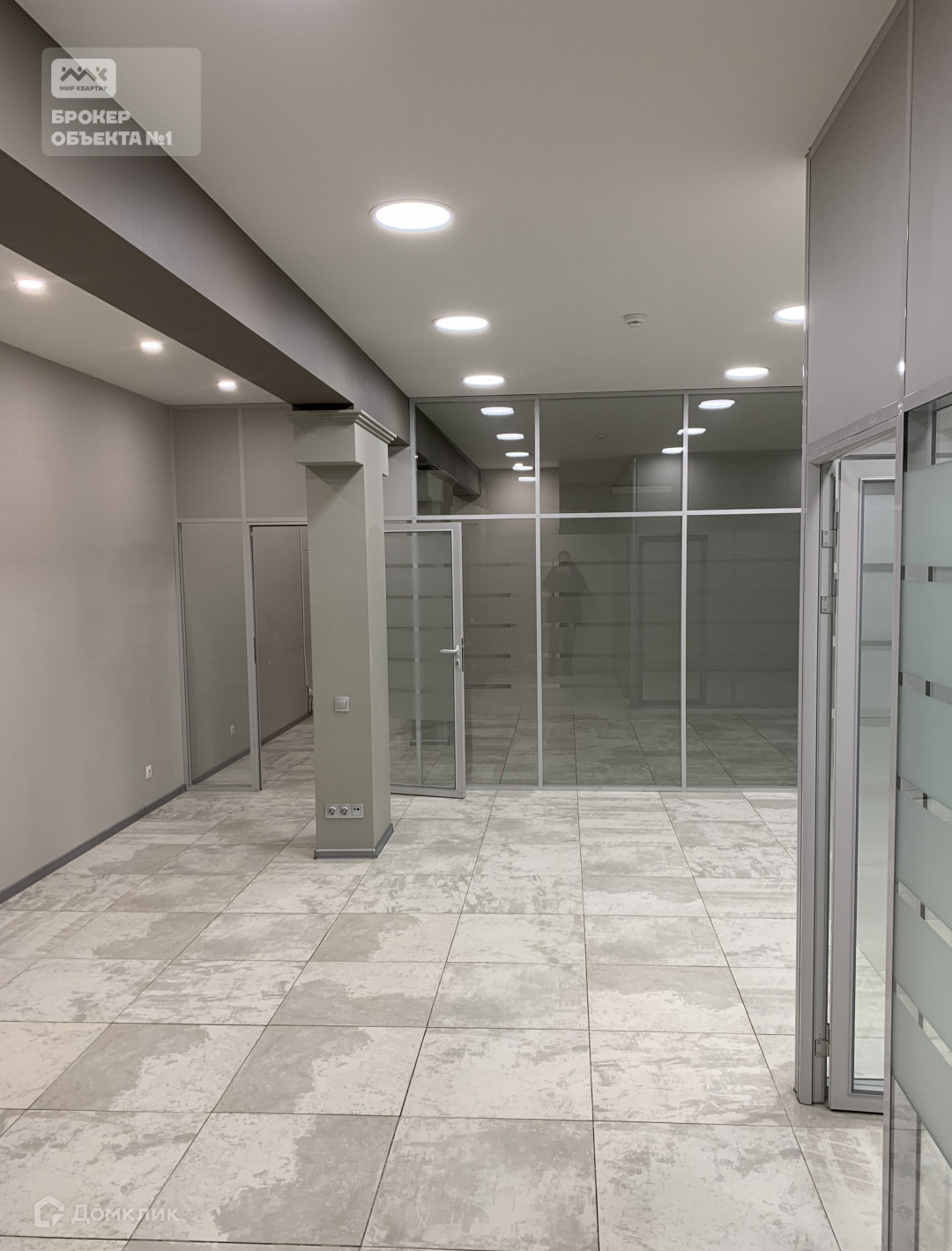 Широкие витринные окна, сделан санузел, есть разделение помещения на кабинеты, пол выполнен из качественной плитки.