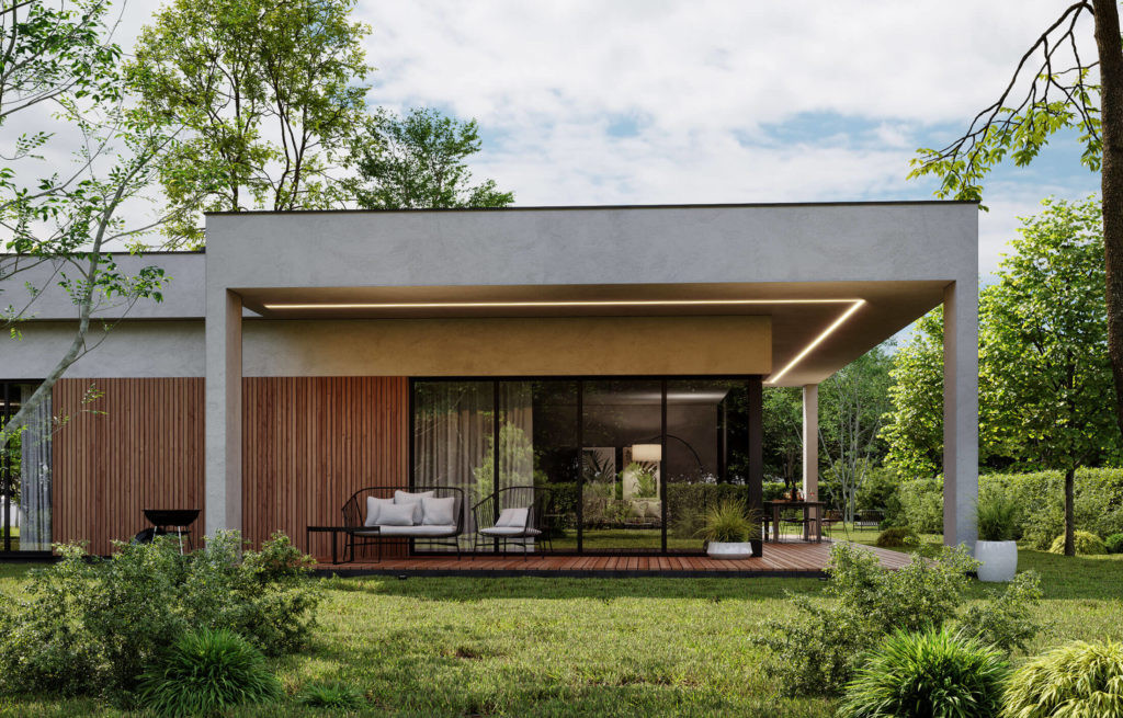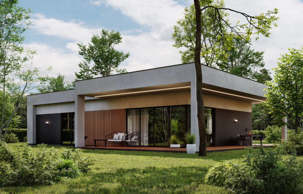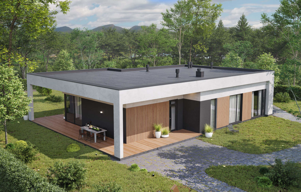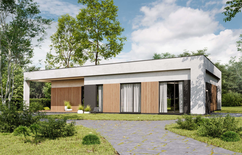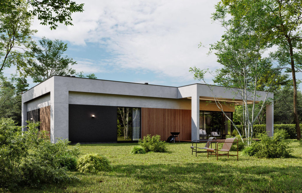 Типовой проект дома разрабатывался с целью оптимизации бюджета заказчиков. Небольшой, но вместительный дом включает в себя все необходимые помещения для семьи из трех человек. Отдельная мастер-зона с санузлом и гардеробной, две спальни и гостиная с выходом на большую террасу.