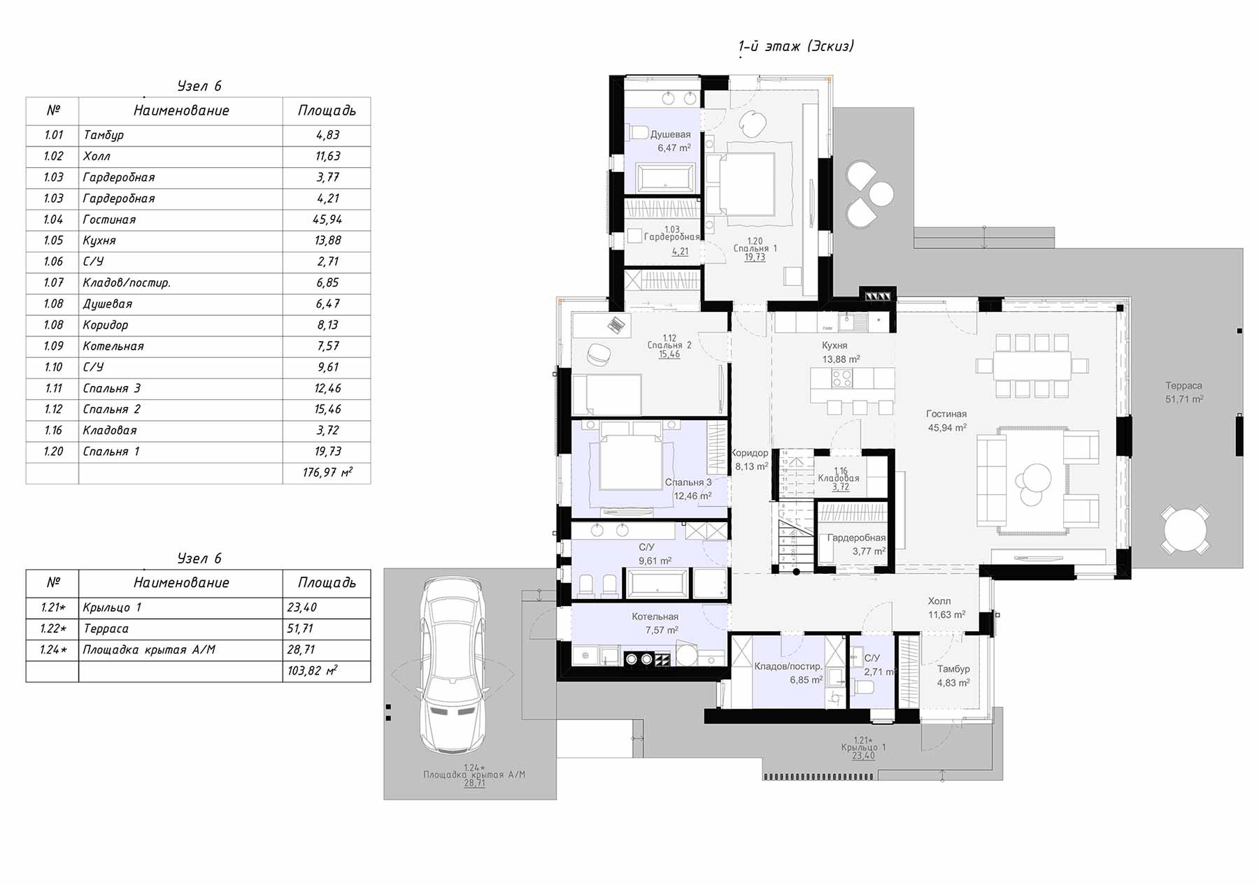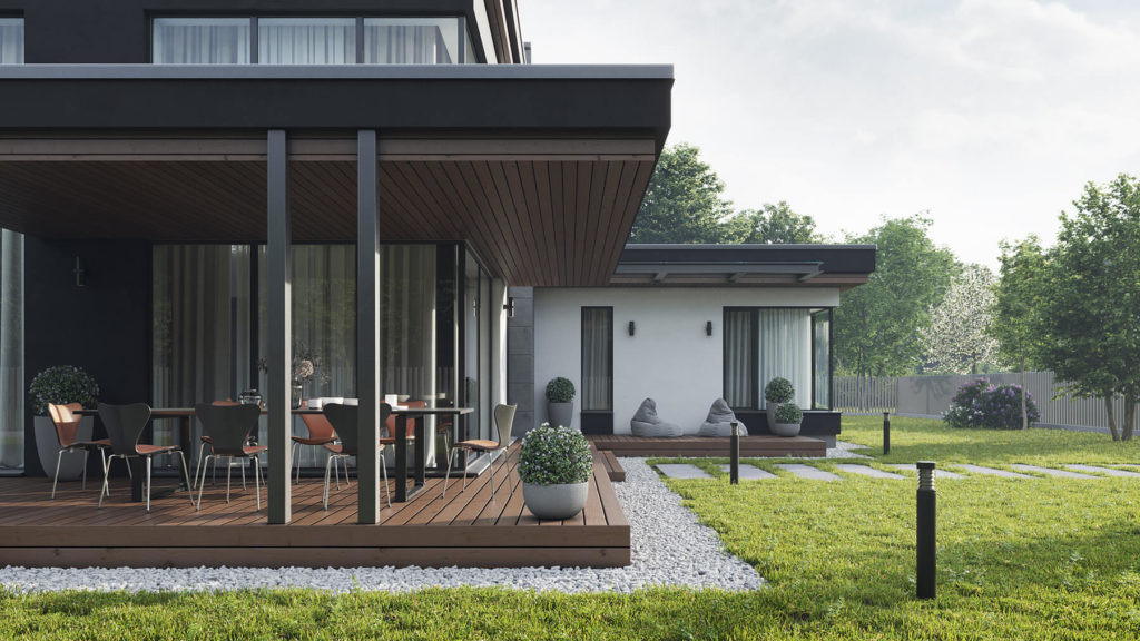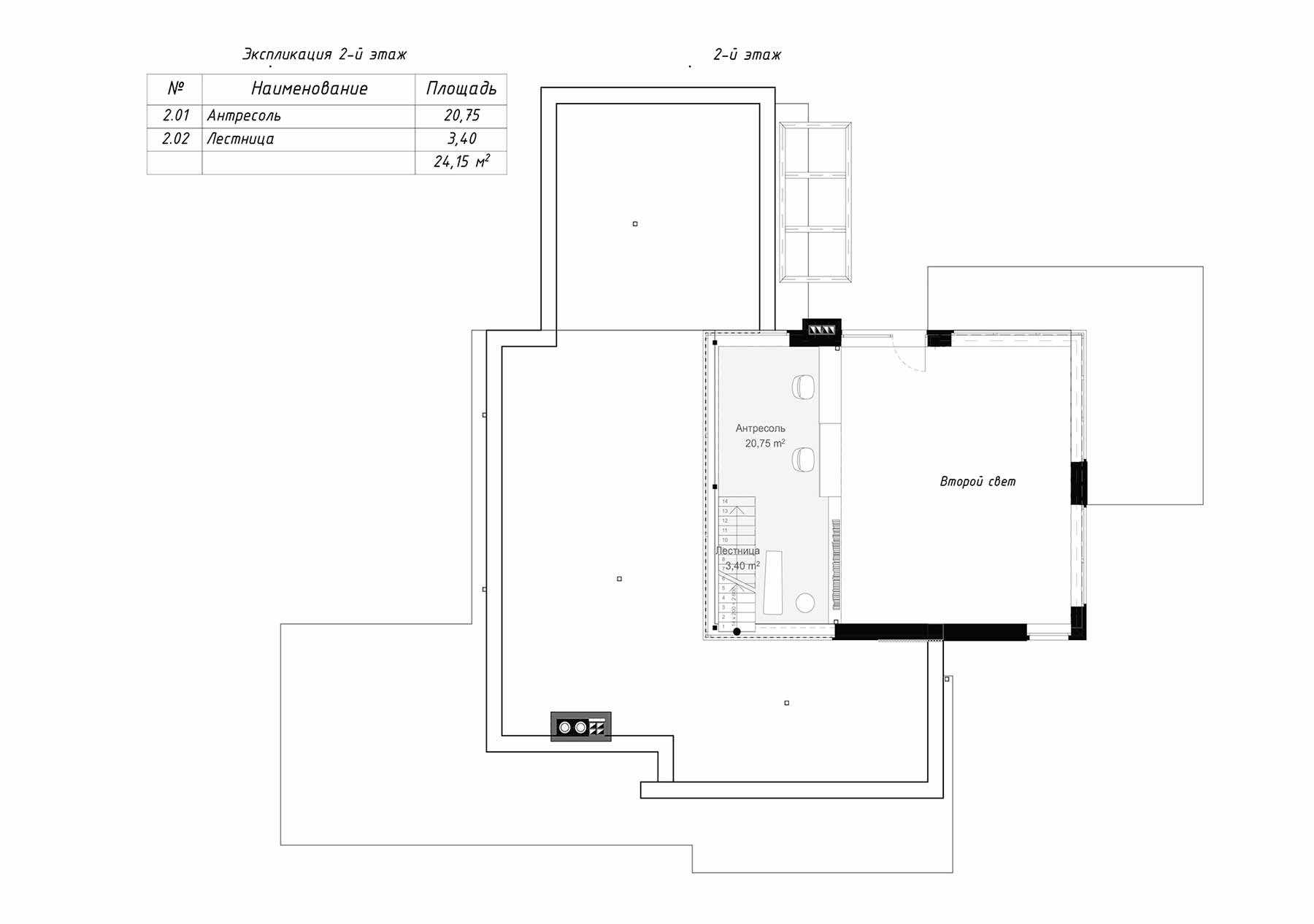 Из общего холла можно попасть на антресоль через небольшую лестницу. Терраса объединяет общую композицию дома. Из общественной зоны имеется прямой выход на террасу площадью 51,7 м2. В доме с комфортом может разместиться большая семья или компания.