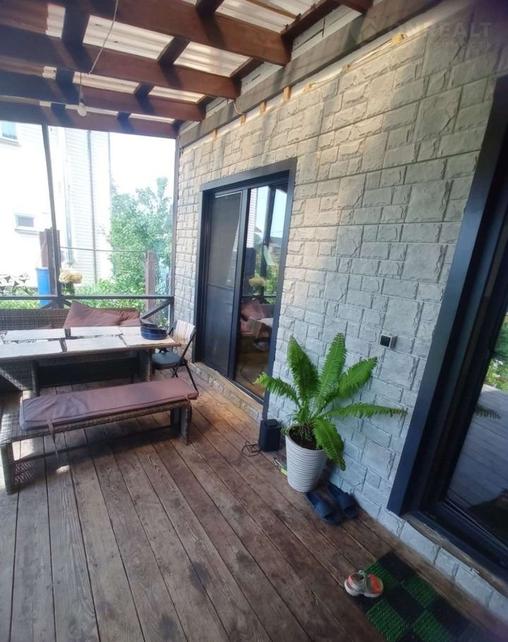С кухни отдельный выход на террасу которая  обшита мягкими окнами что позволяет проводить время до поздней весны и осадки и ветра вам будут не страшны. На крыше профилированный монолитный поликарбонат. Под такой крышей уютней находиться и она не перекрывает свет в кухню.