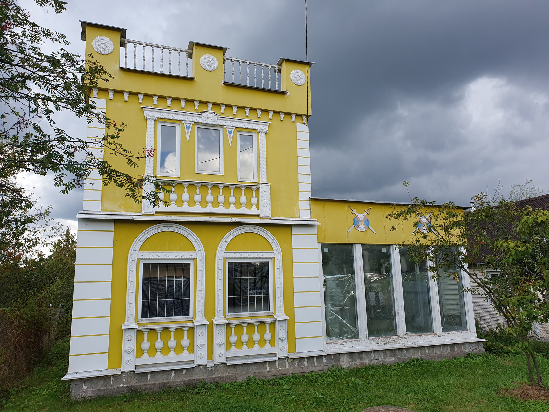 Дом из пеноблоков в виде крепости с фасадным декором. На первом этаже зимний сад совмещен с кухней. В доме 2 спальни, на первом и на втором этаже соответственно. Санузел совмещен с ванной, есть бойлер, туалетом можно пользоваться как в доме, так и на улице. Дом с печным отоплением. Есть электричество, в скором времени проведут газ. На первом этаже под лестницей есть гардеробная. В дом можно заселяться и жить, доработки требует только 2 этаж. Если регистрироваться, то прописка будет городская.