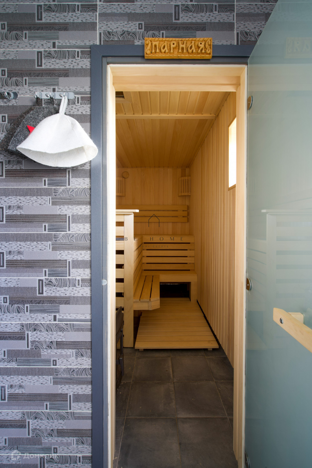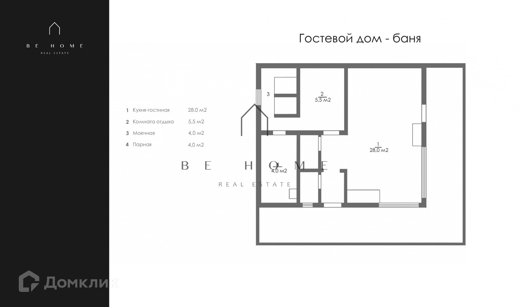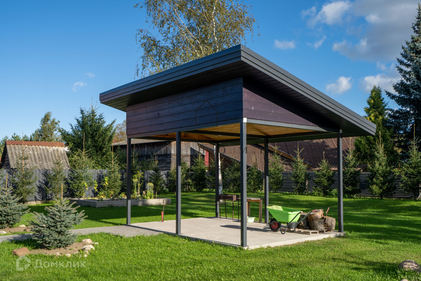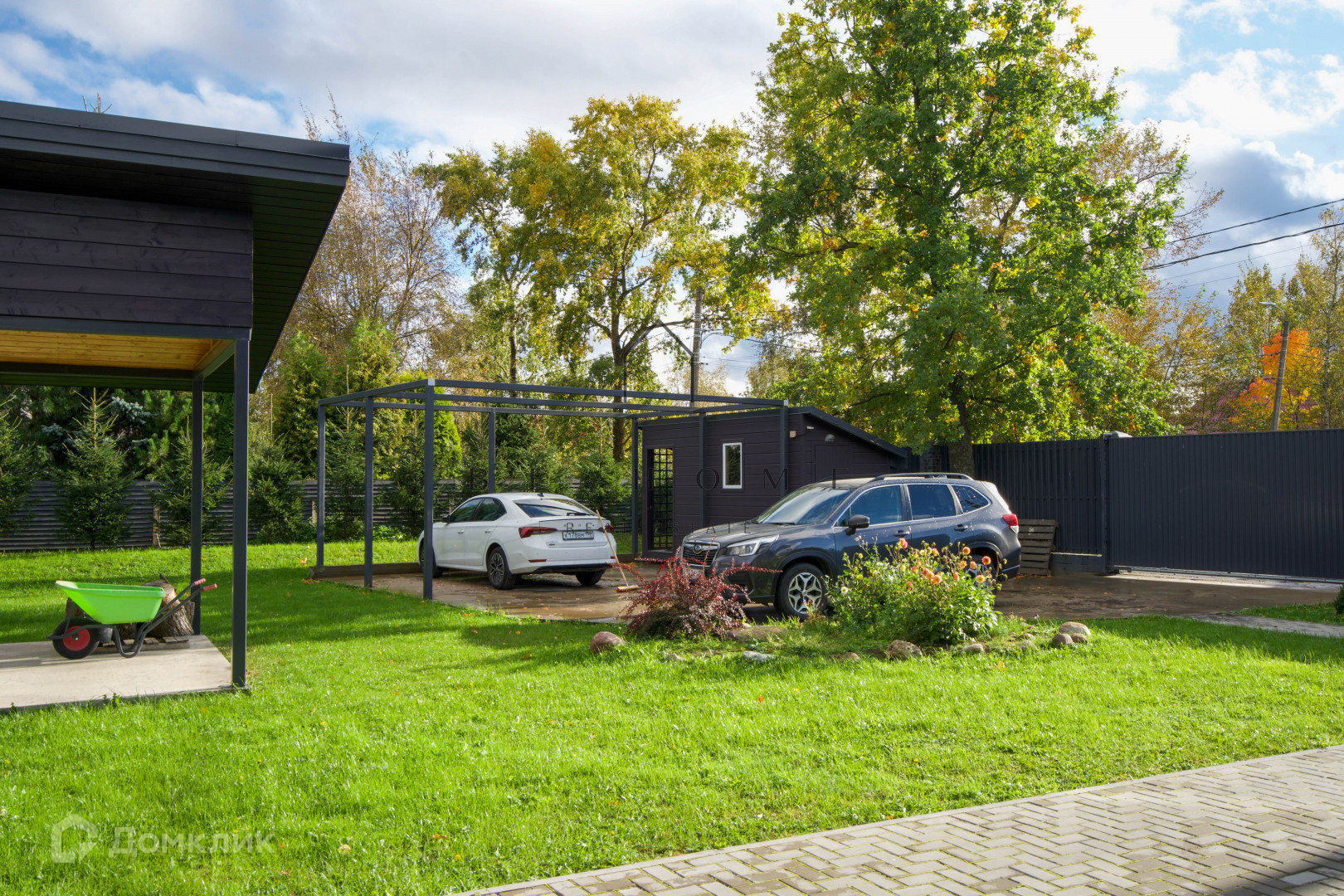 Гостевой дом-баня: Отдельно стоящий автономный комплекс включает кухню-гостиную, комнату отдыха, душевую и парную с печью "Атмосфера", оформленную из липы и абаши. Здесь можно расслабиться после насыщенного дня в тепле и комфорте. На задней части предусмотрен хозблок для садового инвентаря.