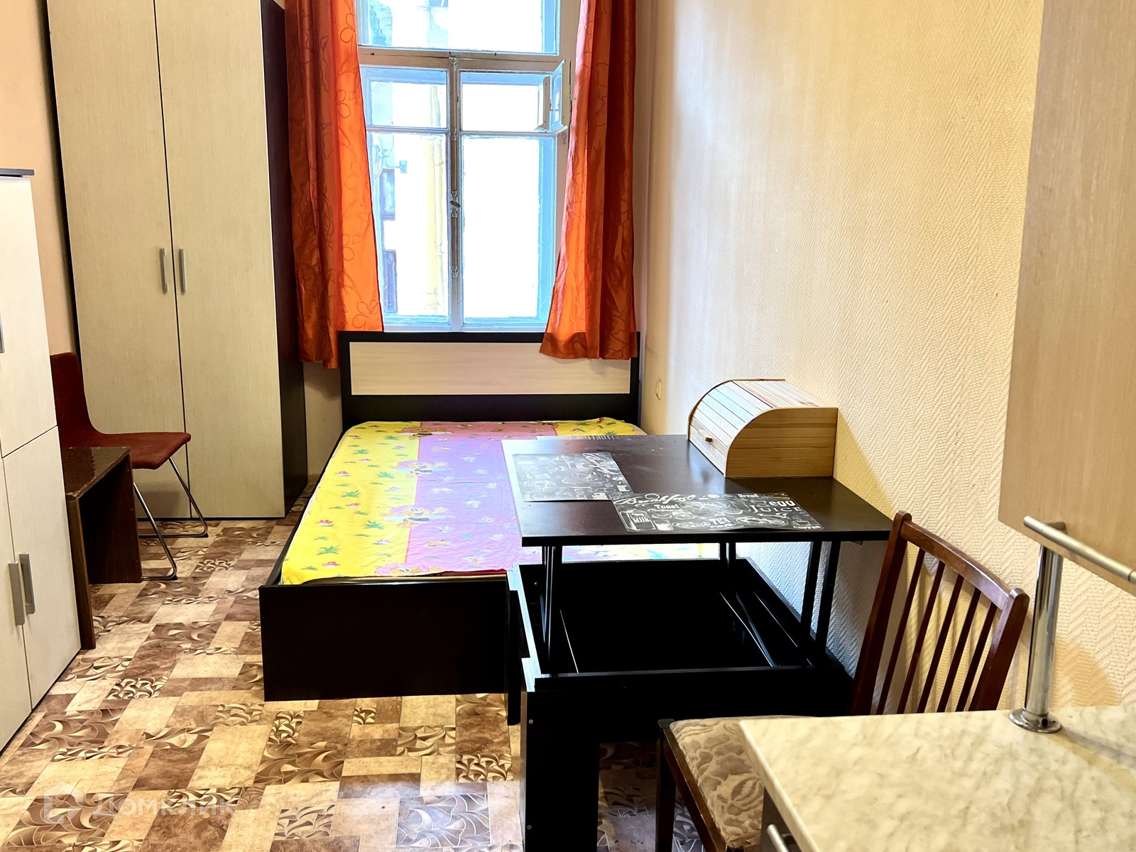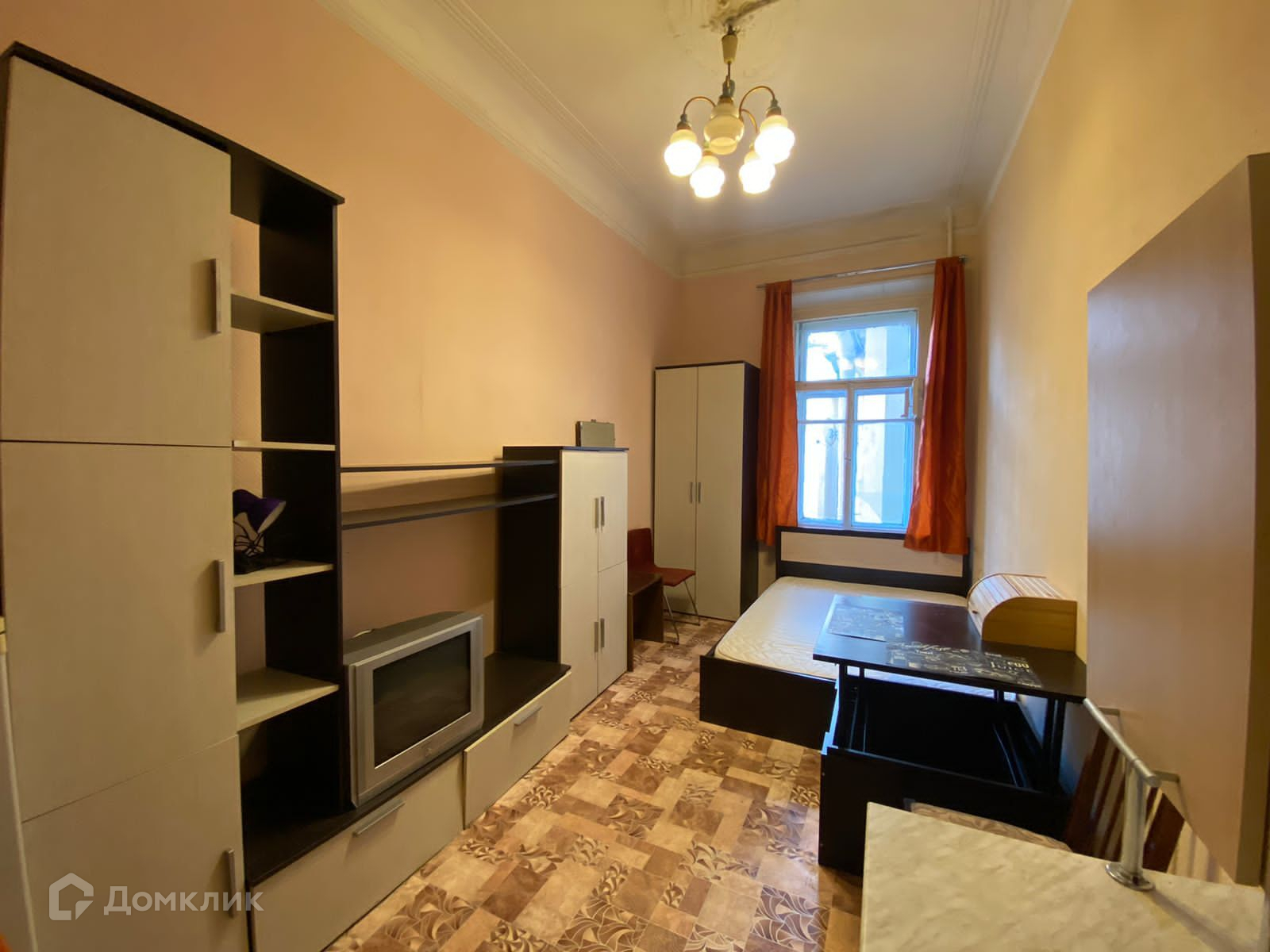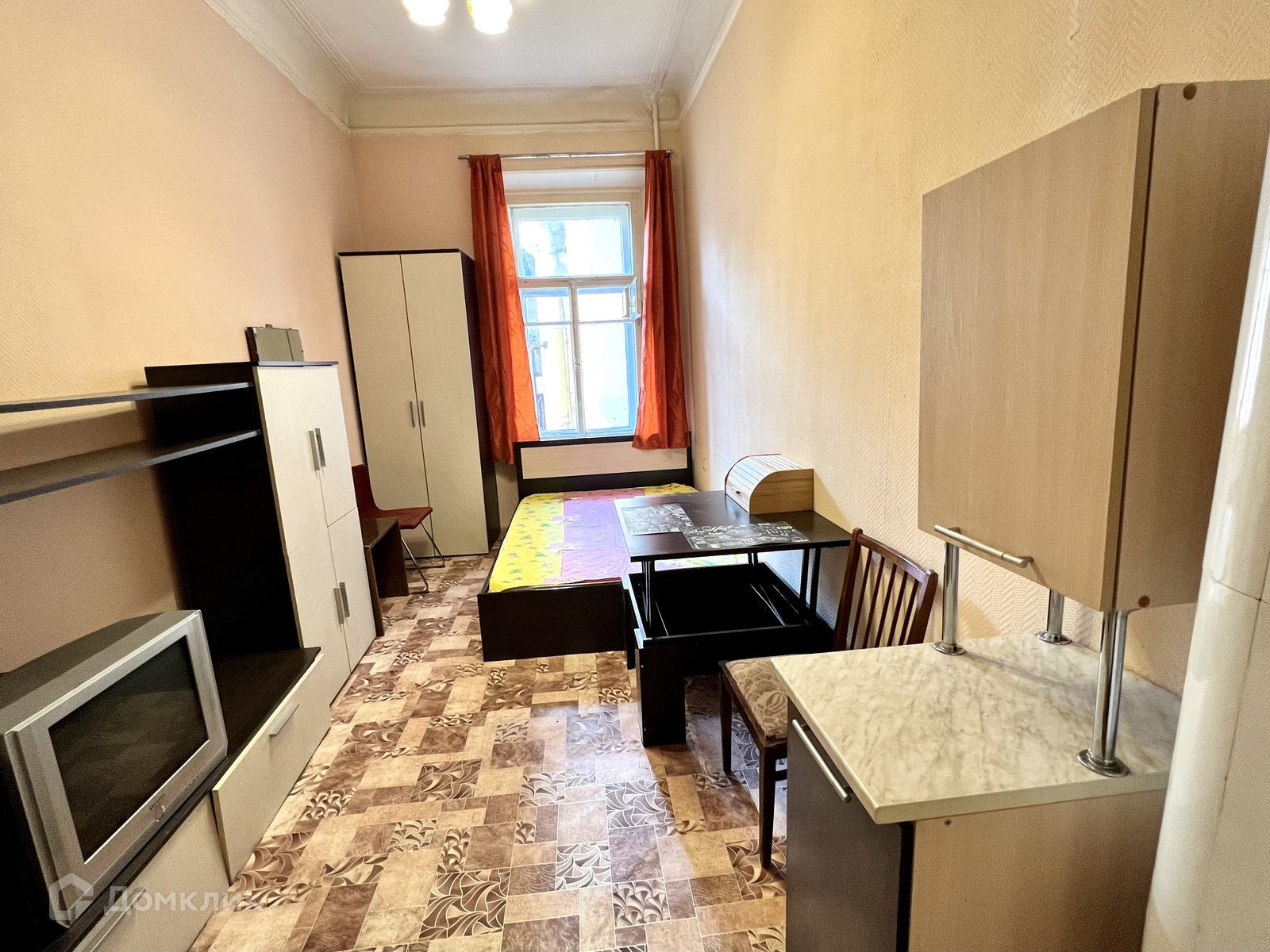 Комната уютная, высокий потолок, с одной стороны бабушка соседка, с другой ванная комната. В комнате остается вся мебель и техника.