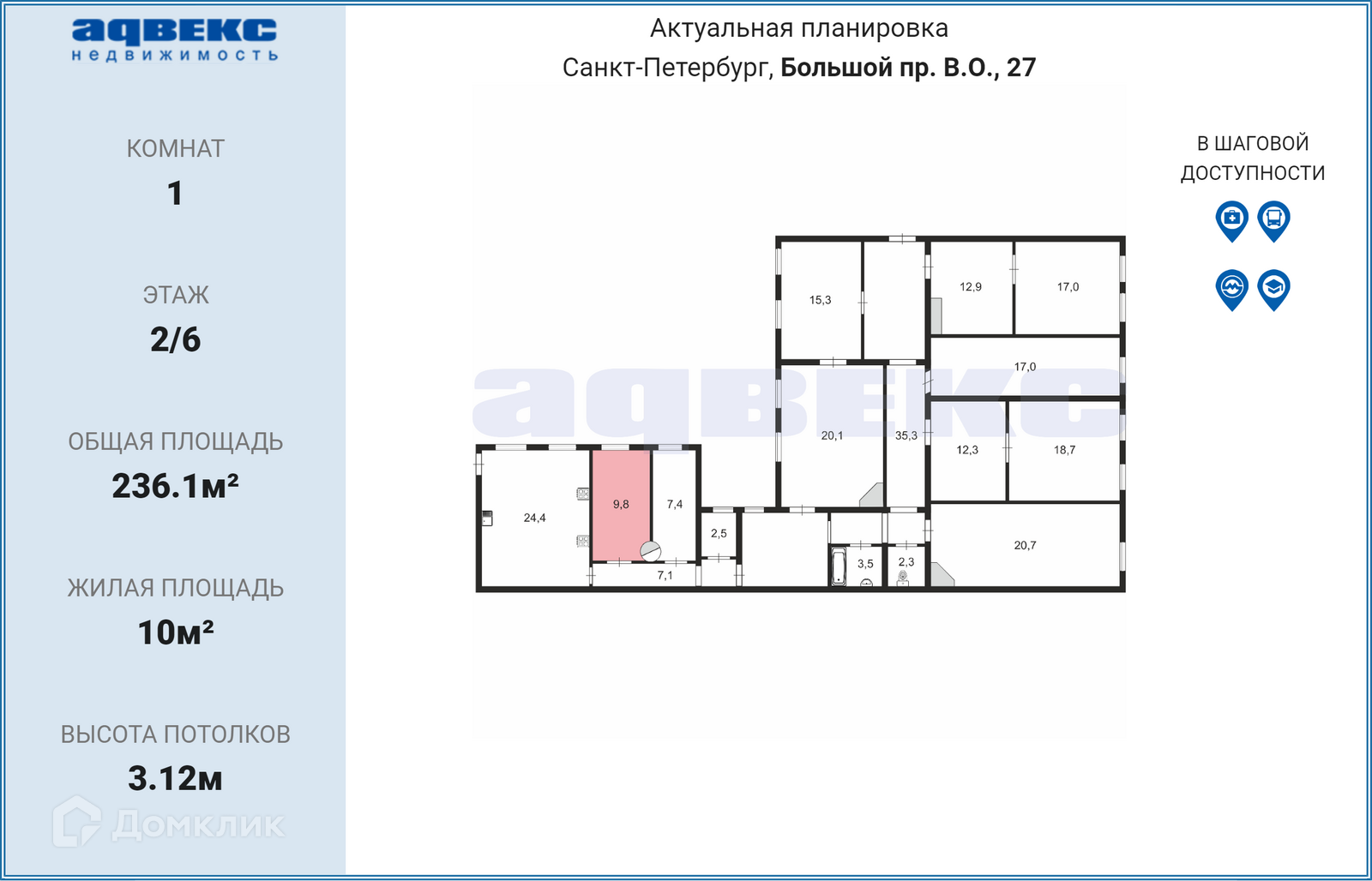Комната, 236.1 м2, на продажу в Санкт-Петербурге, Большой проспект Васильевского острова, 27