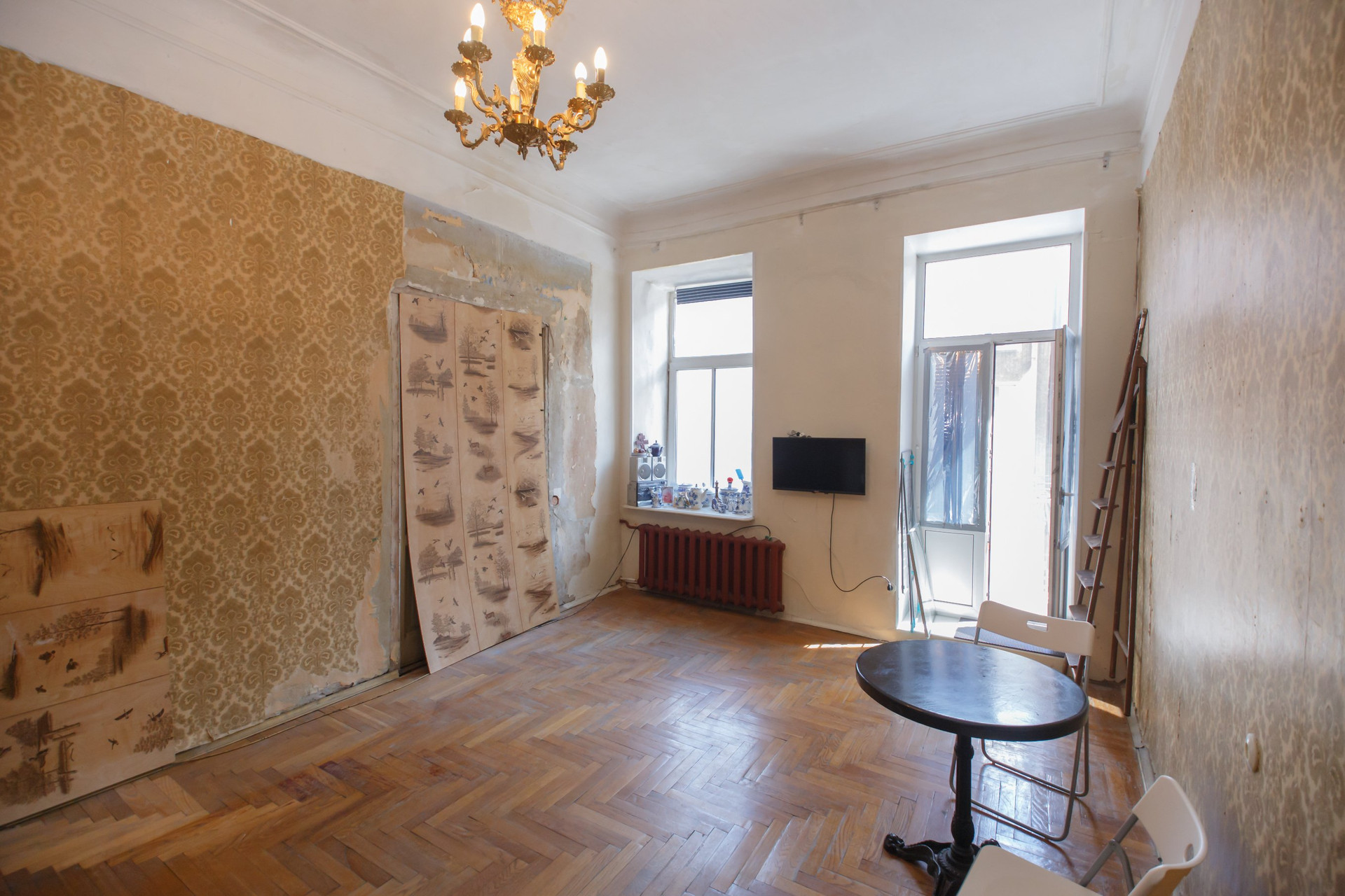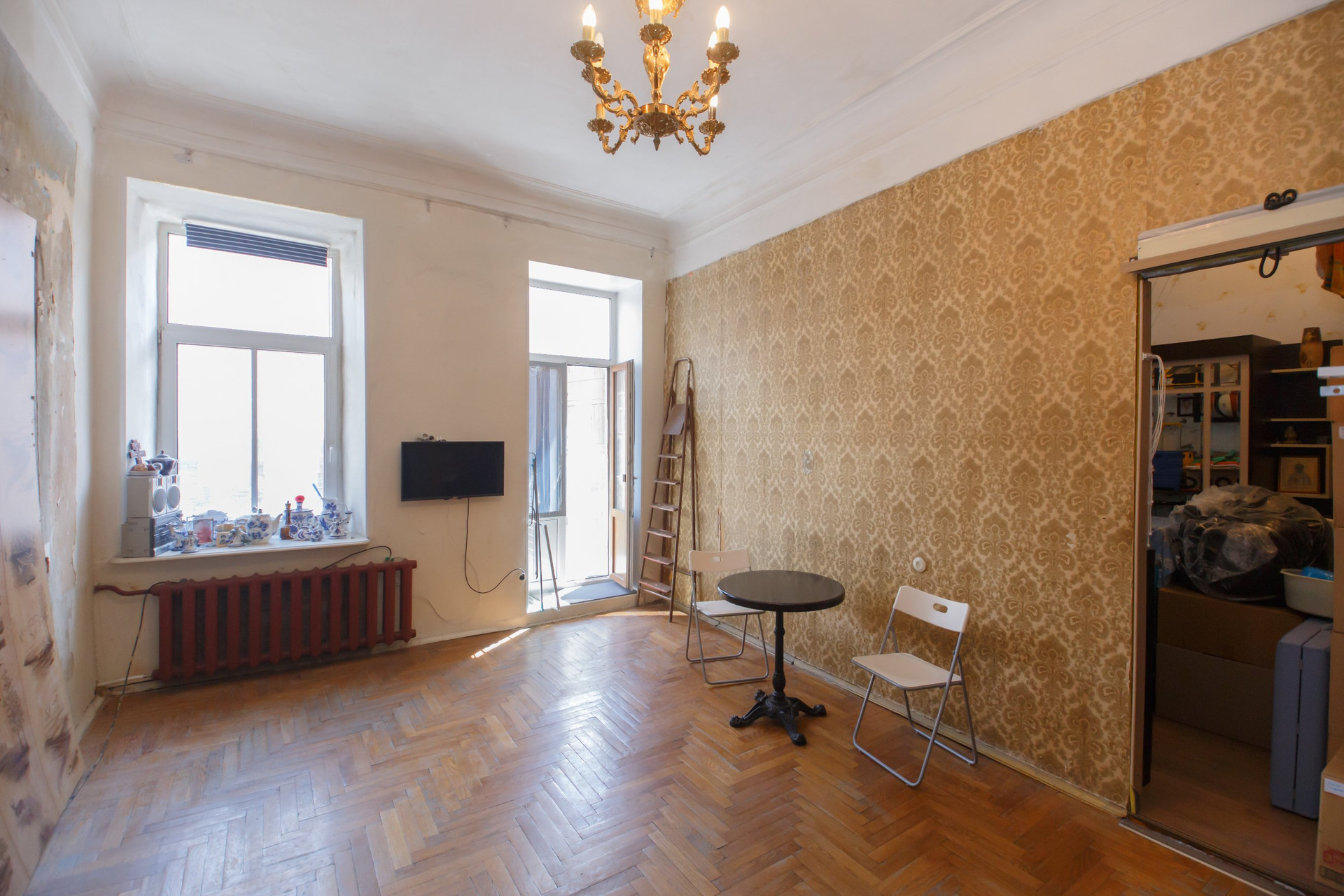 Расположена на 3 этаже 6 этажного дома в фасадной части. Год постройки - 1874. Капитальный ремонт 1955 год. Видовая. Балкон. С балкона открывается панорамный вид на город. В комнате 3 окна, очень светло. Потолки 3.46. Кухня 21,6 кв.м. В квартиру два входа (через разные парадные). Раздельный санузел. Перекрытия – дерев. и бетон. По металлическим балкам.