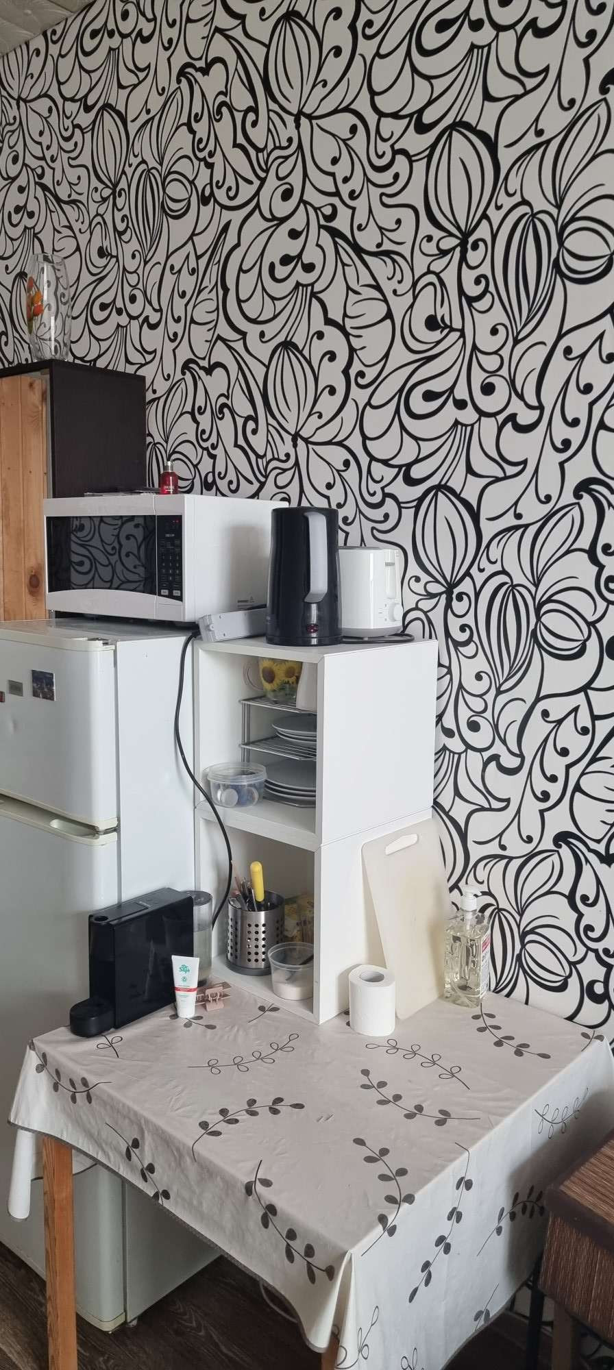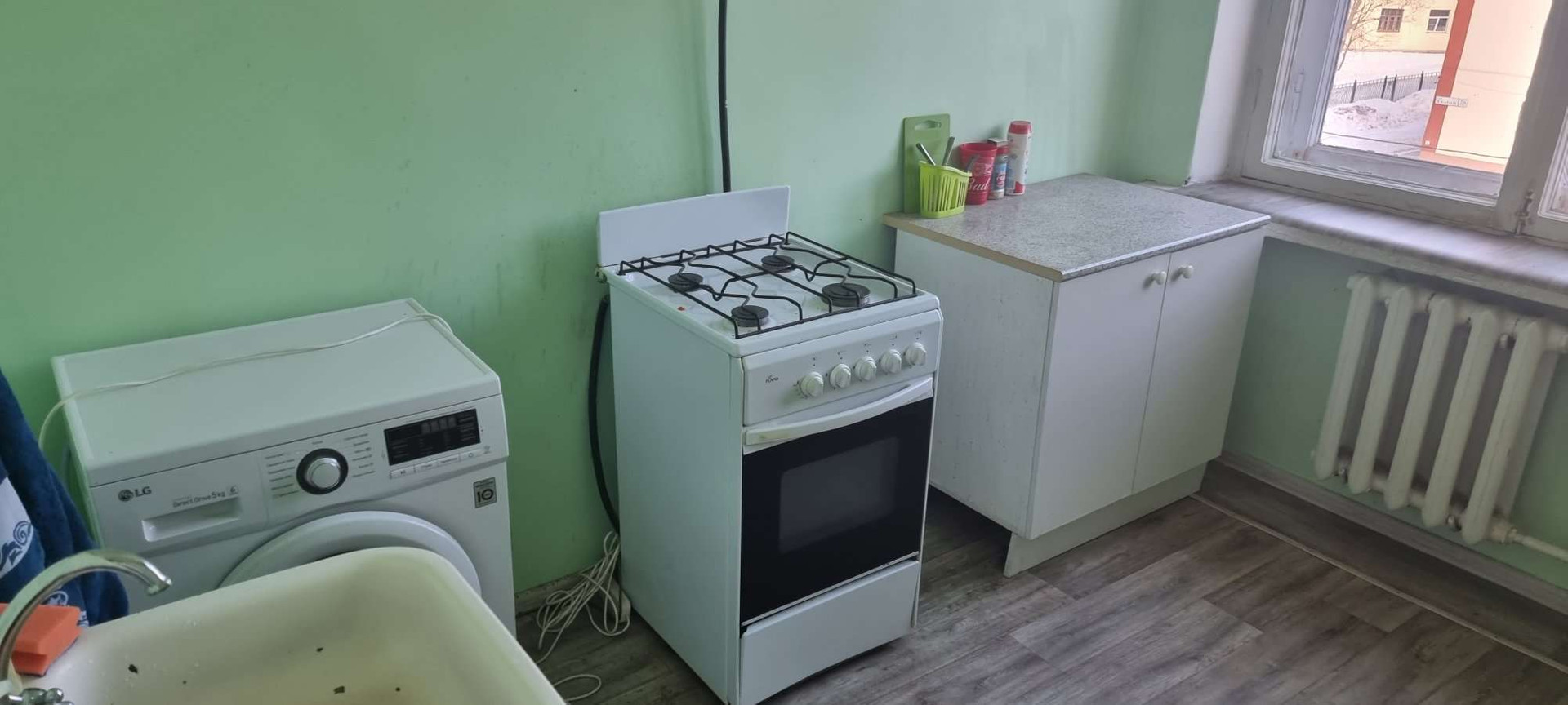 Помимо этого проведен вай-фай, есть кое-что из посуды, всякие швабры, сковородки, чашки