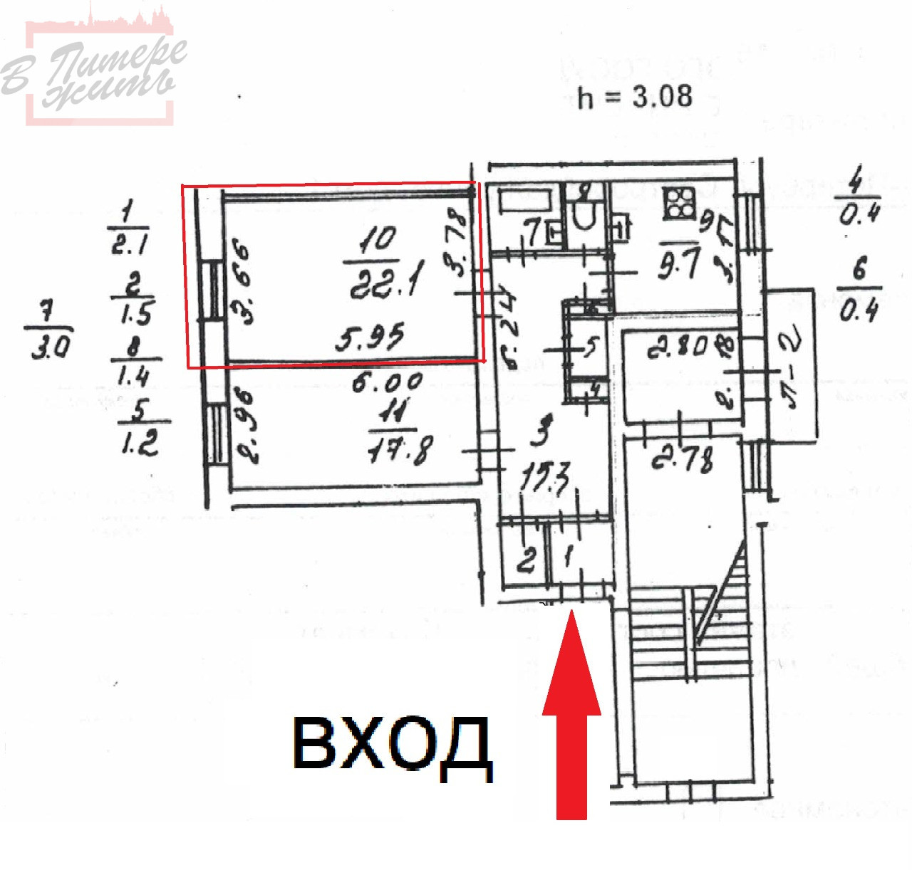Высота потолков 3.08 м