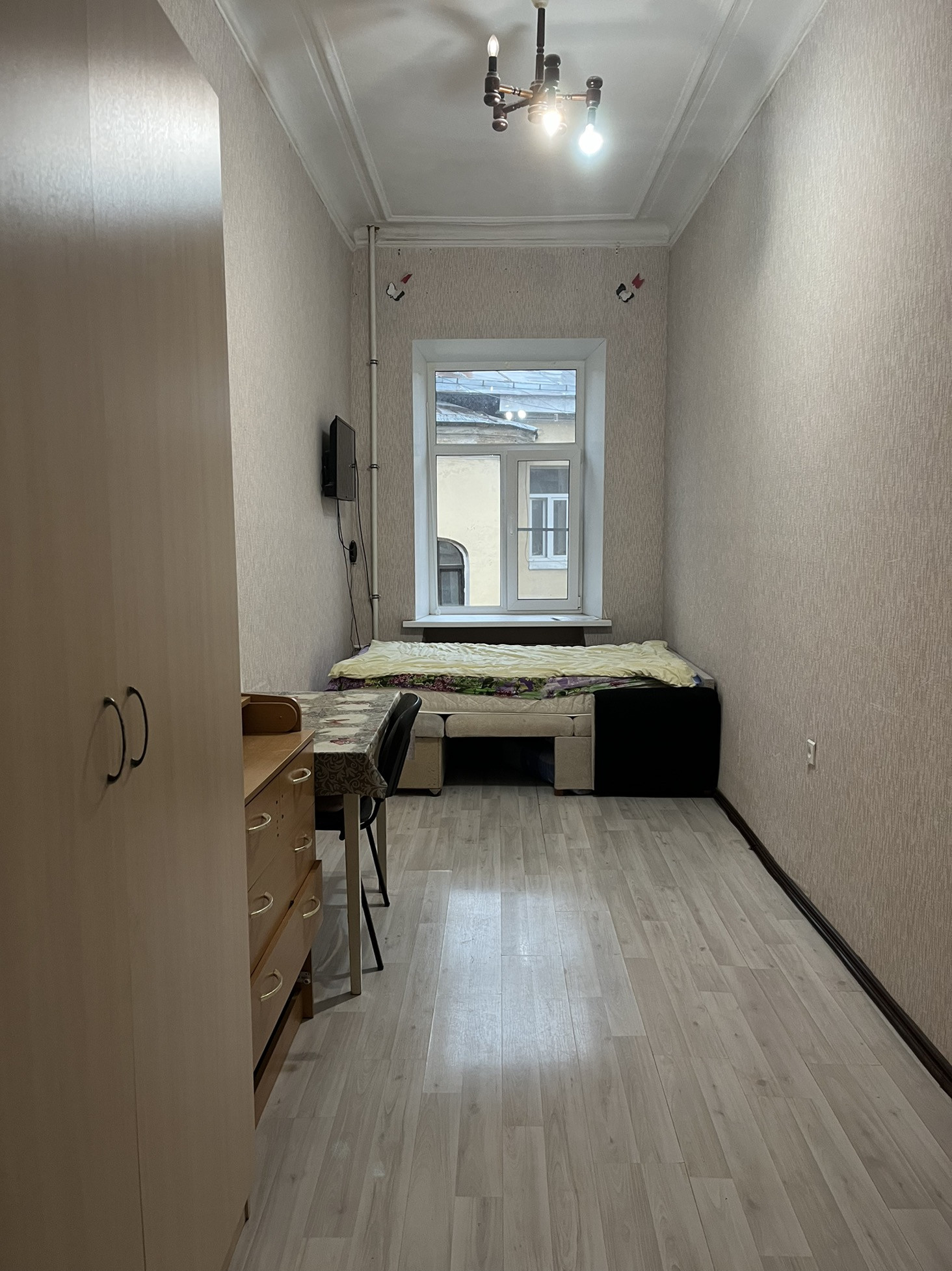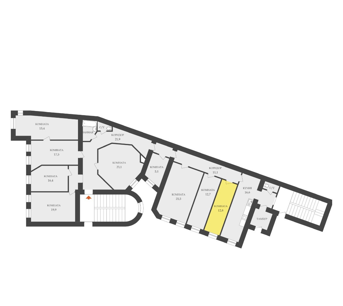 Общая площадь квартиры 212,8 кв.м., площадь комнаты - 12,8 кв.м. Окна выходят во двор. Высота потолков – 3,36 м. Тихие соседи, подойдет как под сдачу в аренду, так и для проживания.
