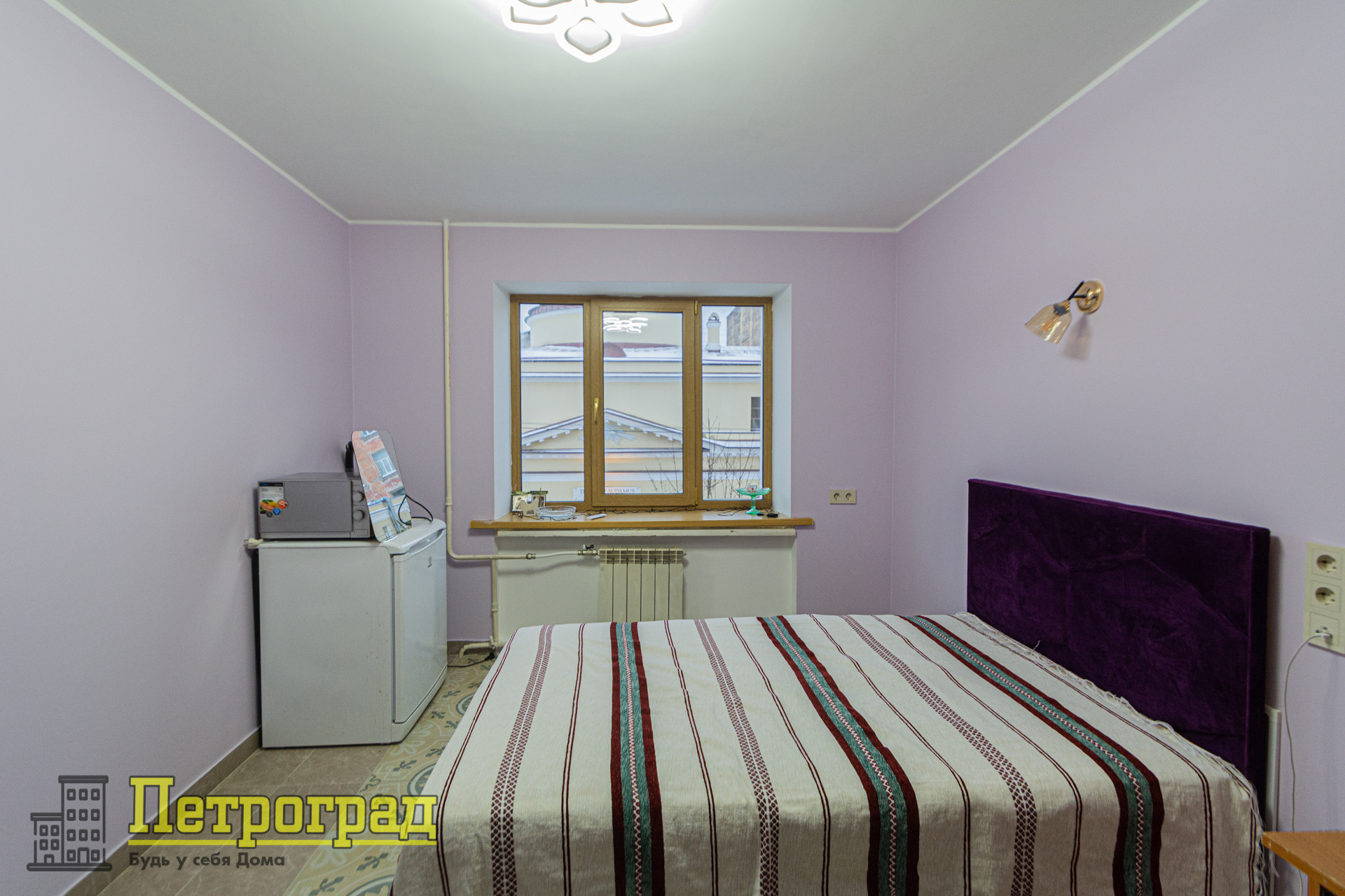 Окно выходит на улицу, вид на церковь святого Станислава, сделан качественный ремонт: установлены стеклопакеты, новая эл. разводка, розетки с usb разъёмом, выровнены все поверхности, потолок и стены покрыты моющейся краской Тиккурила; пол плитка, заменен радиатор отопления, отопление можно отключать, установлены новые двери. Новая кровать с ортопедическим матрасом была подобрана под интерьер комнаты.