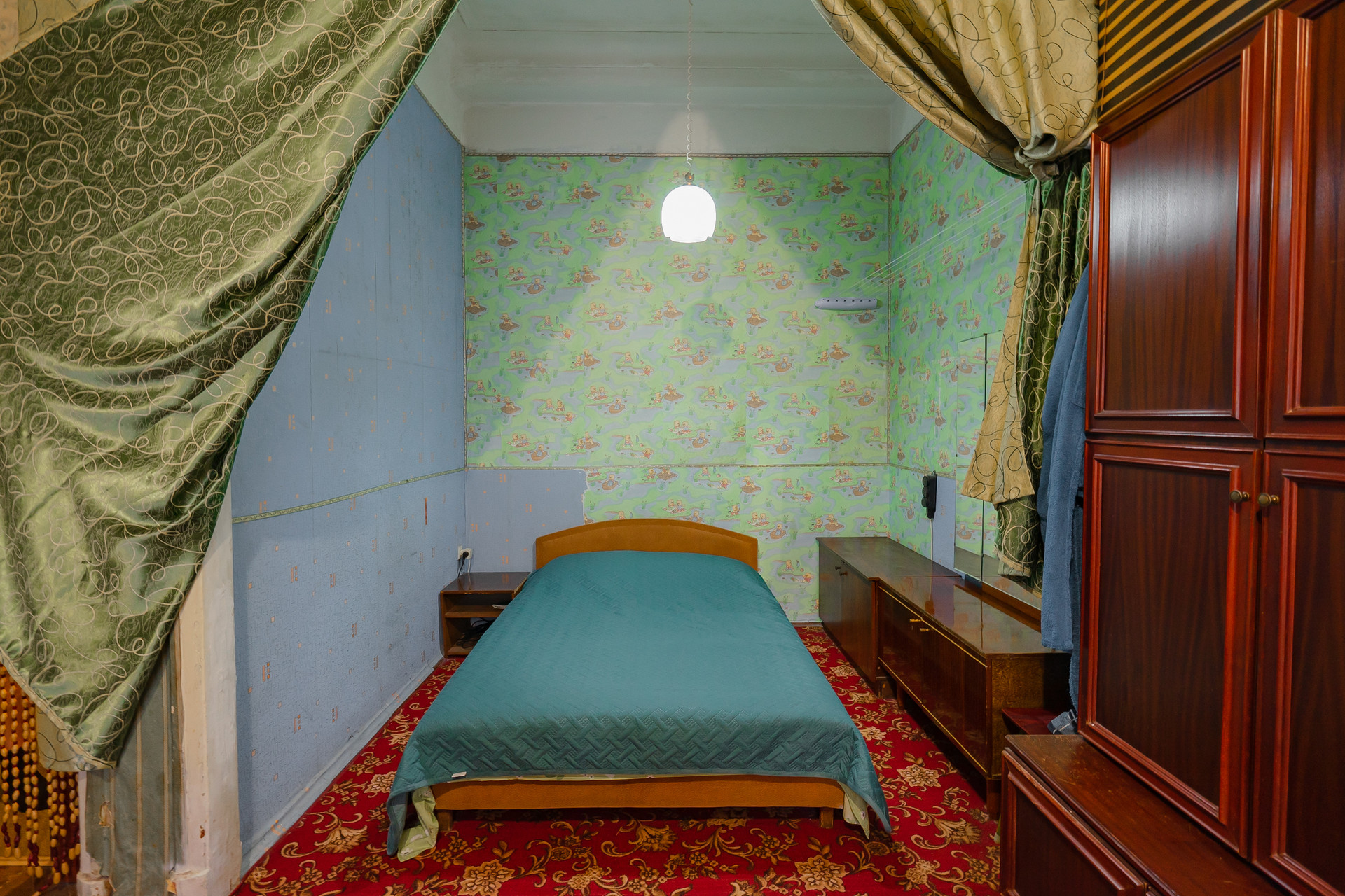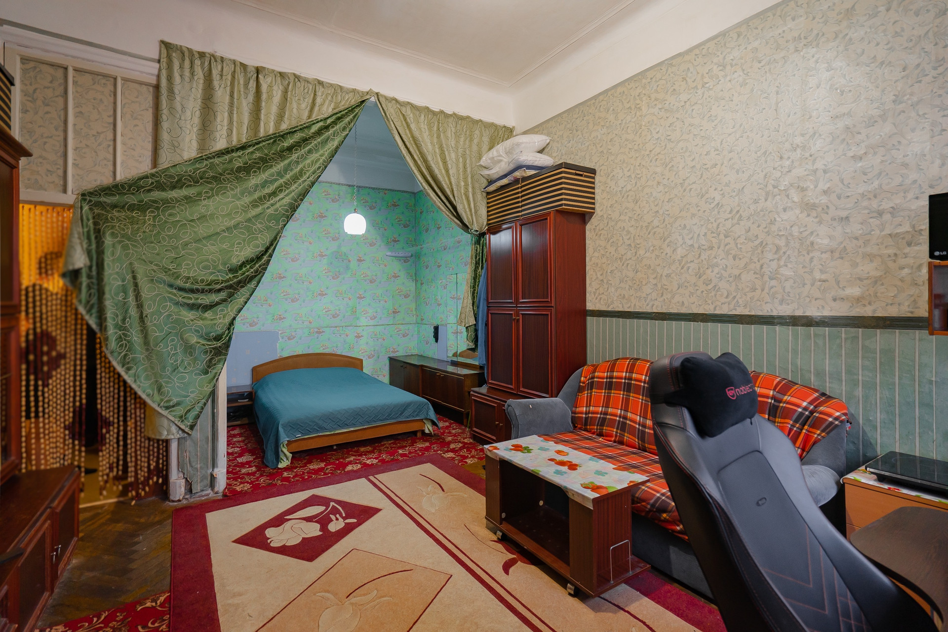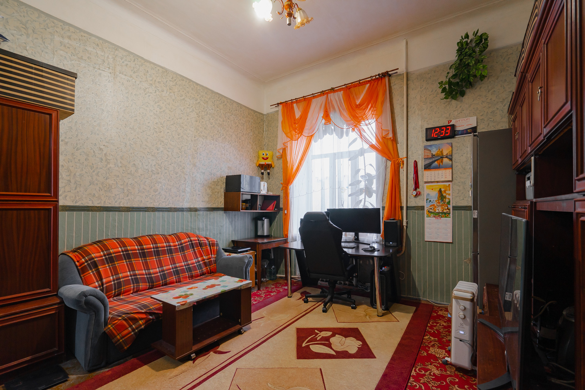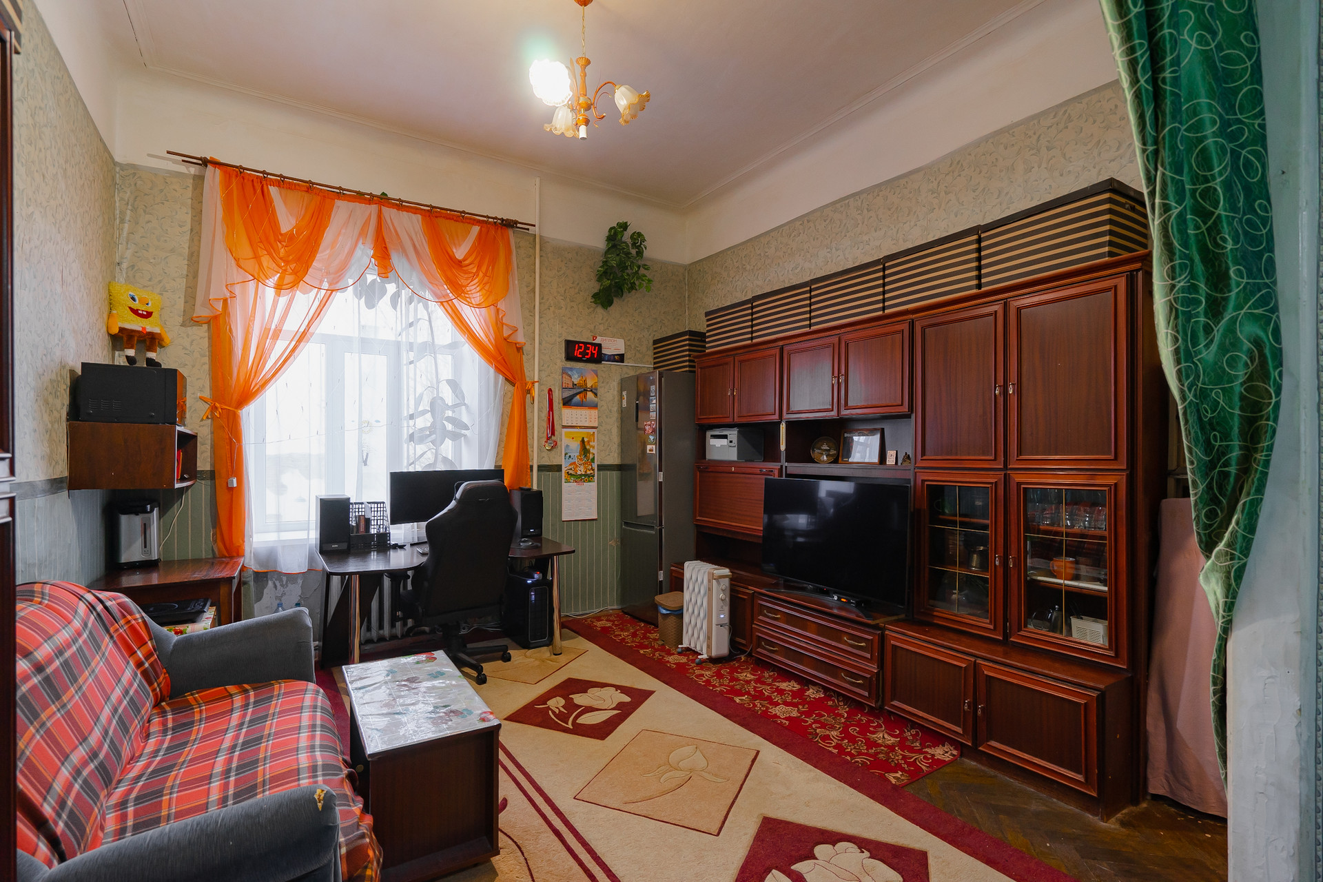 Комната теплая,просторная с высотой потолков 3,8м. Выход окон во двор на спортивную площадку .