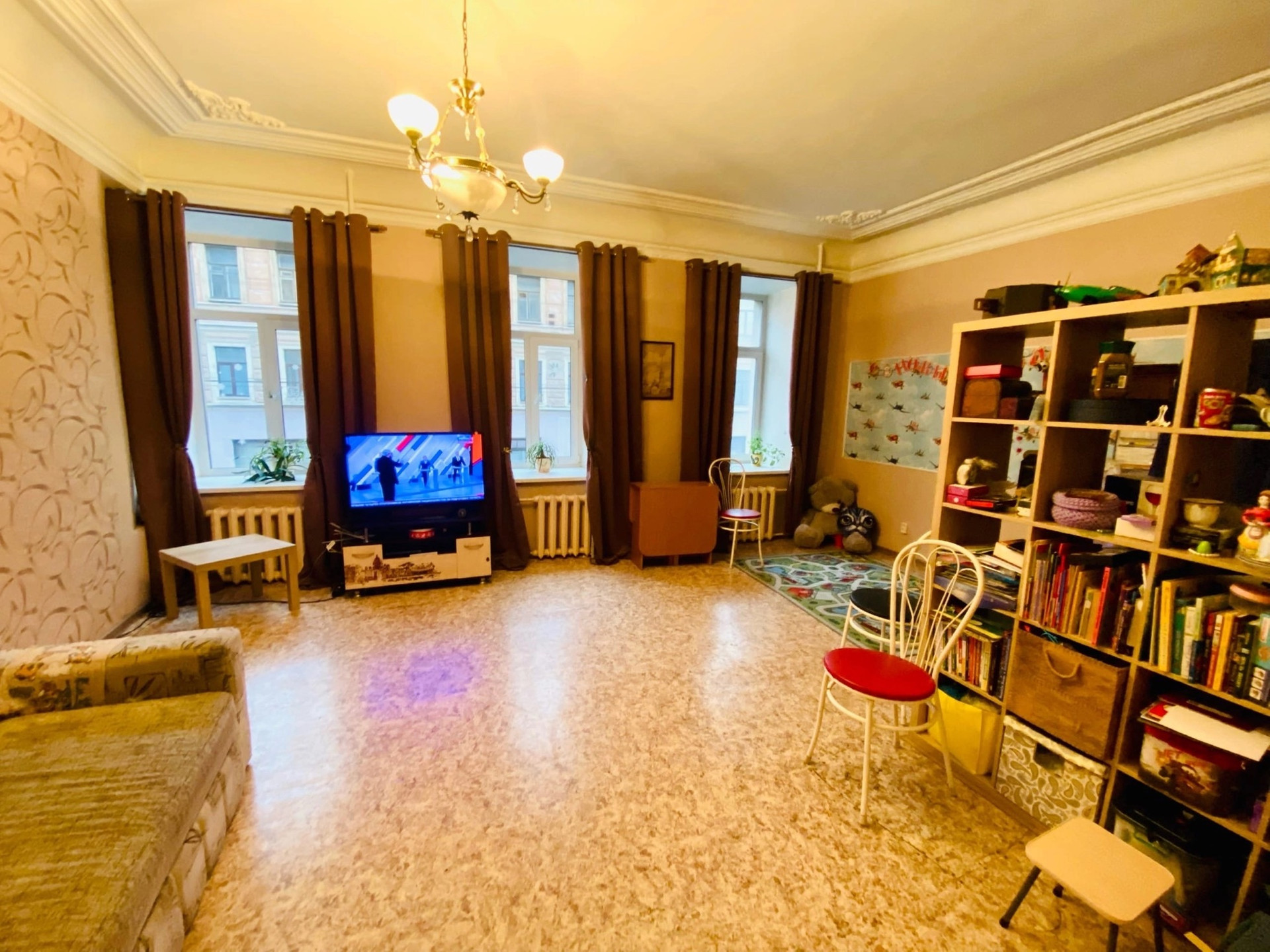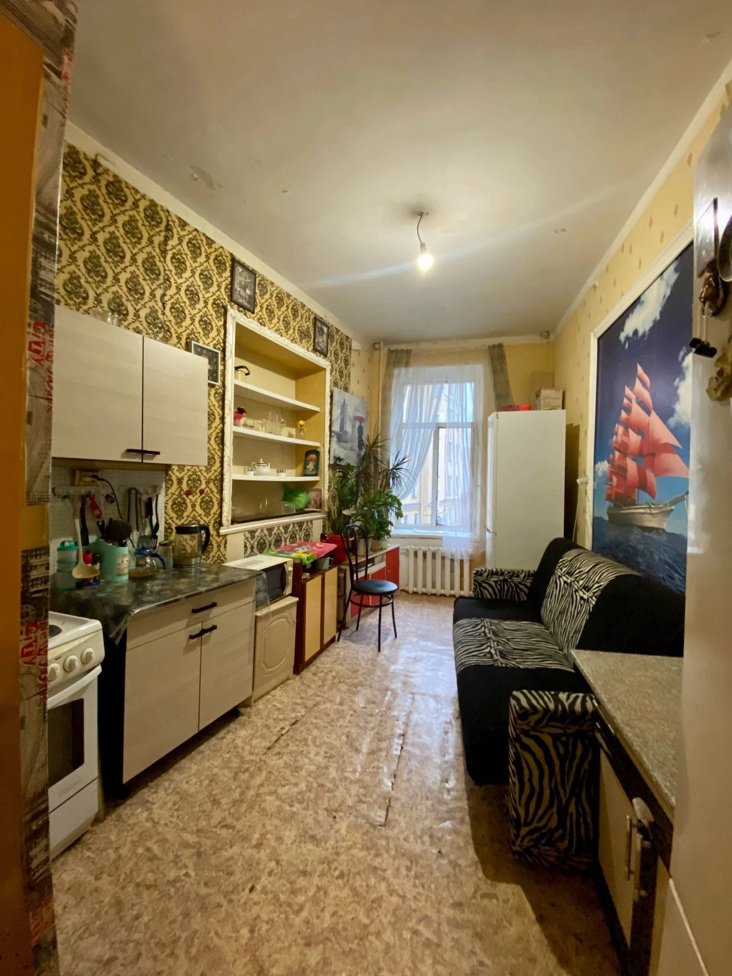 Комната светлая, с 3-ми окнами, с возможностью зонирования кухонной и спальной зоны.