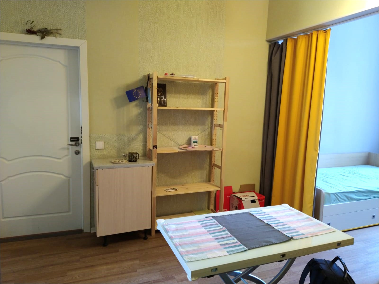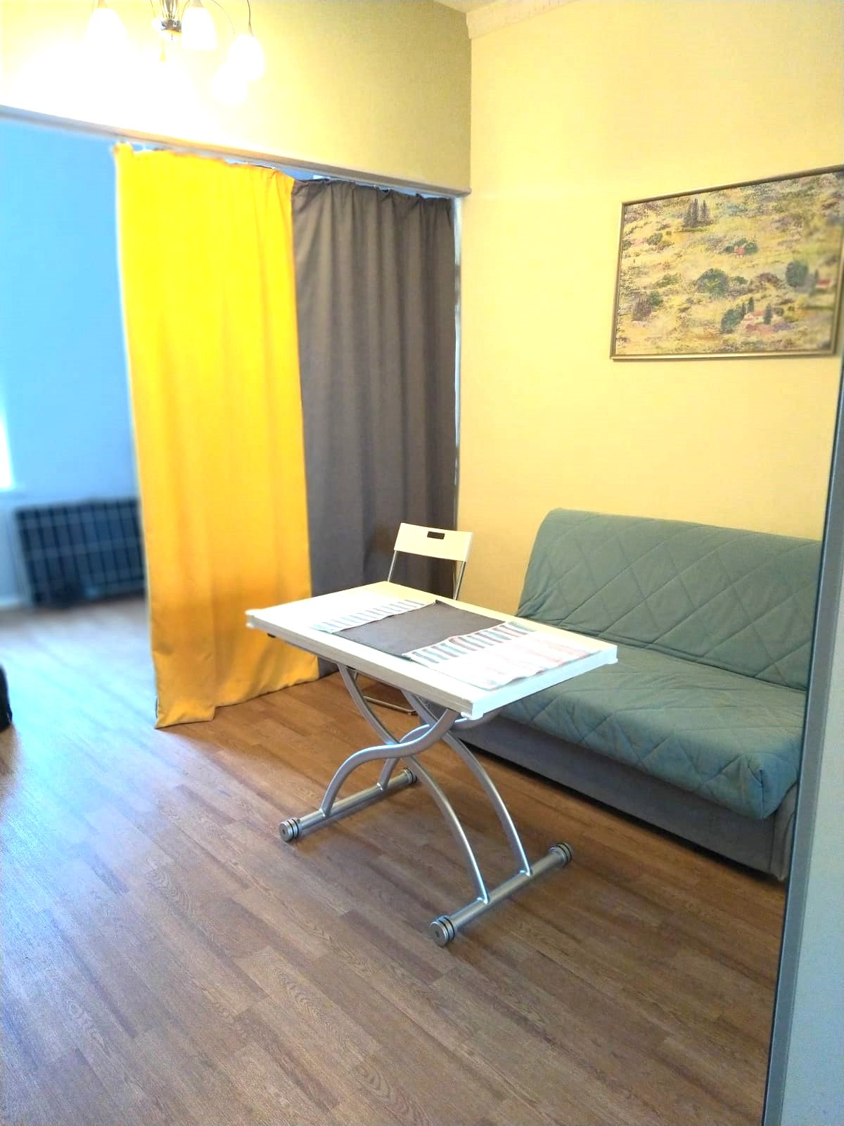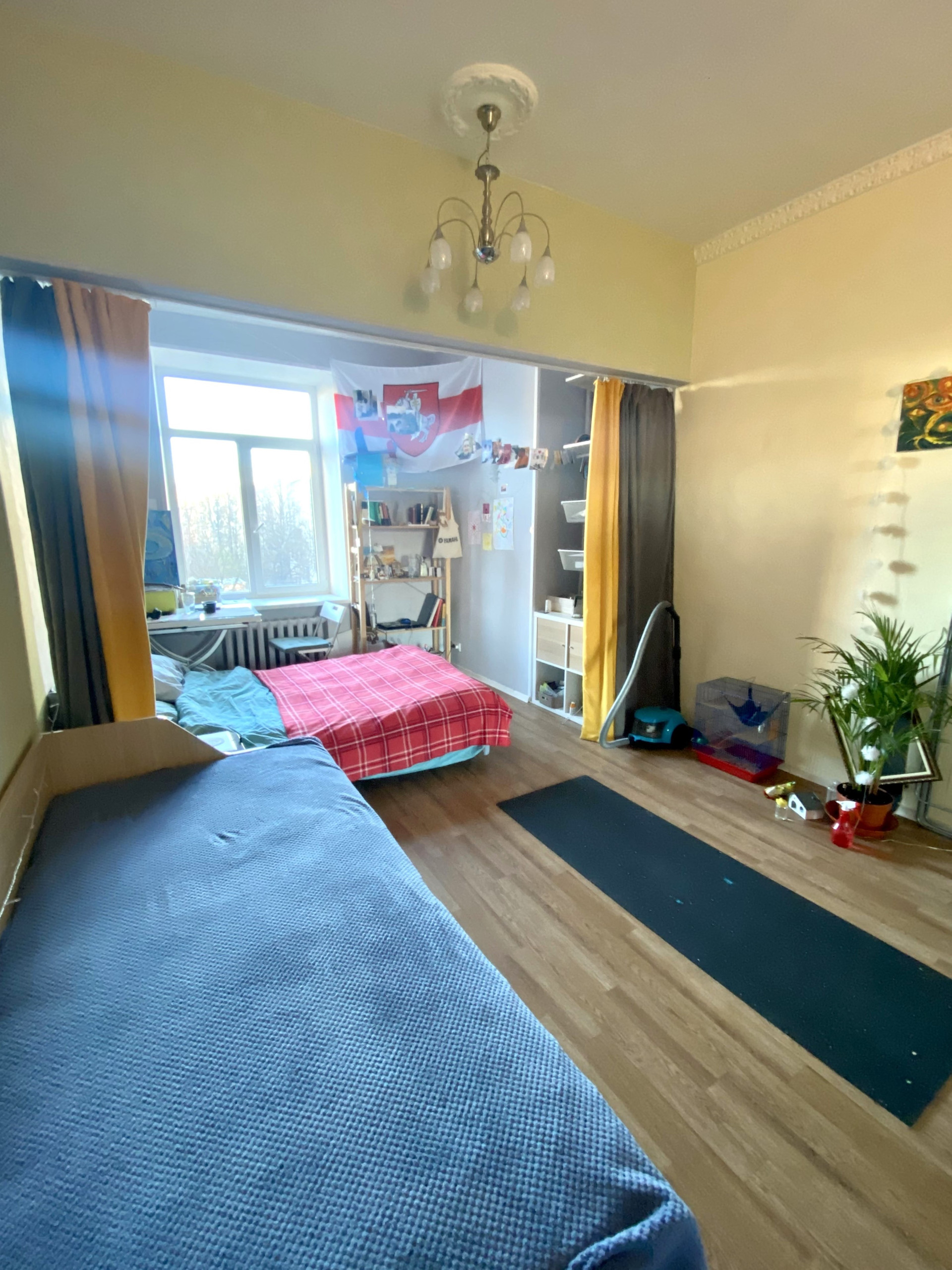 В комнате в 2020 году сделан качественный ремонт с зонированием: просторная площадь комнаты позволила разделить ее на гостиную и спальную зоны. В комнате тепло, установлены новые стеклопакеты. Покупателям остается всё необходимое для жизни: двухместный диван-кровать с ортопедическим матрасом, кровать с ортопедическим матрасом, шкаф, стол-трансформер, тумба, стеллаж, встроенный мини-шкаф, кухонная мебель, холодильник, стиральная машина. Мебель и техника свежие, в хорошем состоянии.