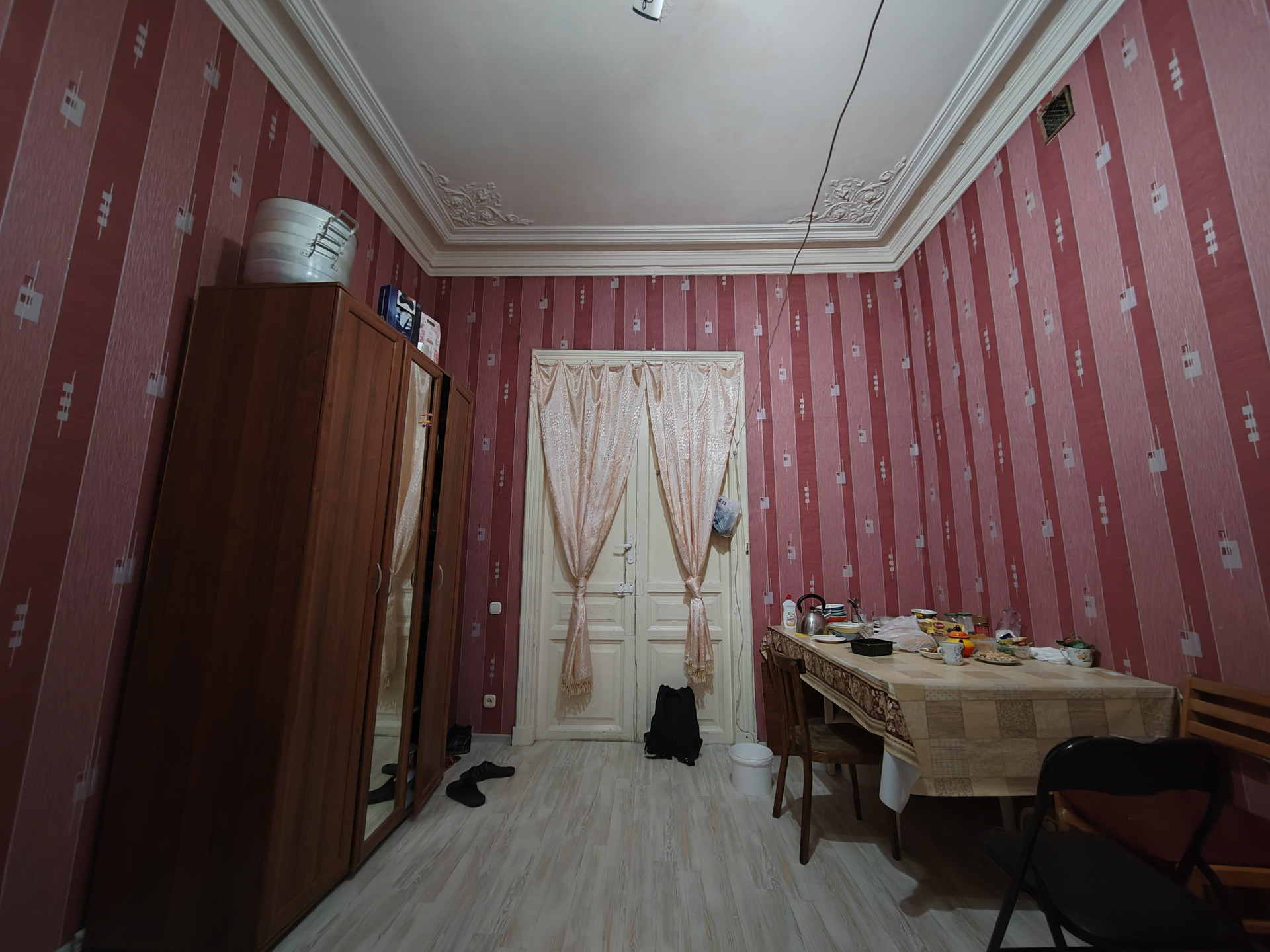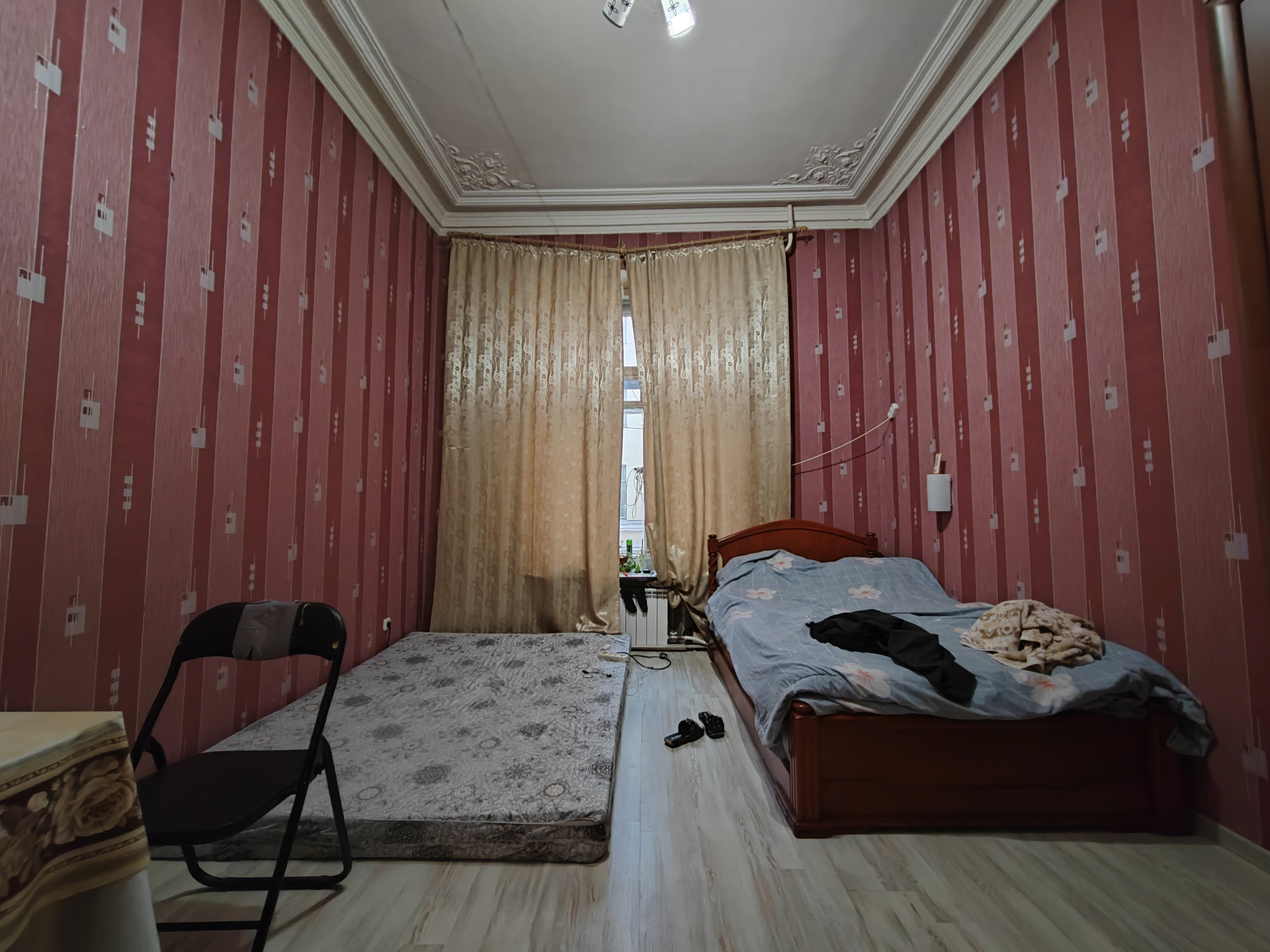 В комнате выполнен косметический ремонт. Площадь комнаты – 16,9 кв.м. Общая площадь квартиры – 196,4 кв.м. Кухня – 17,8 кв.м. Отдельный санузел – 0,9 кв.м. Ванная комната – 2,5 кв.м. Высота потолков 3,6 метра.