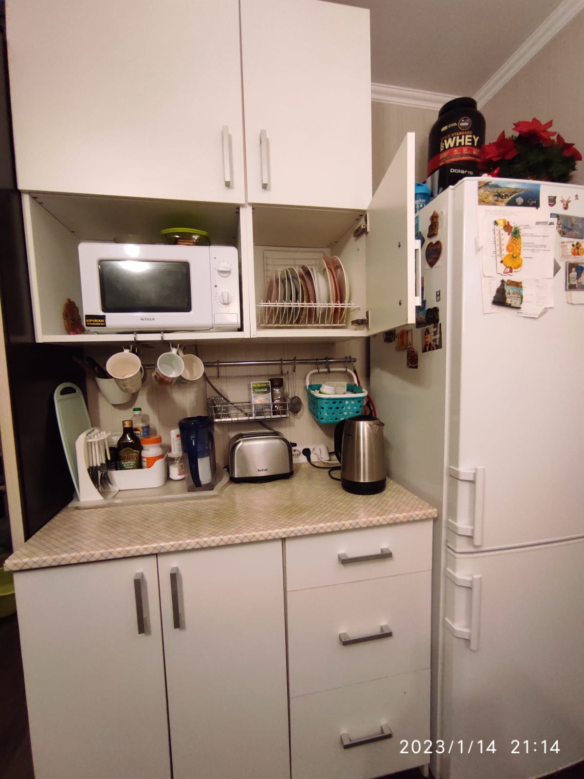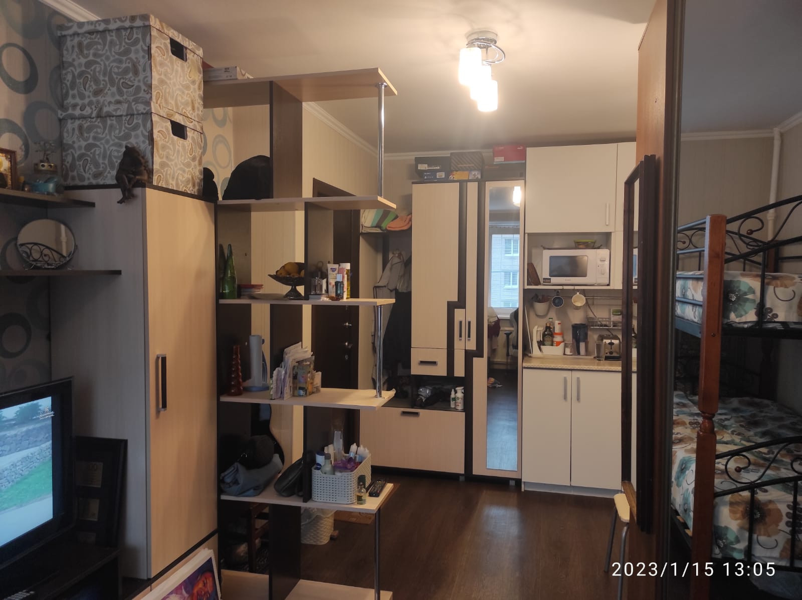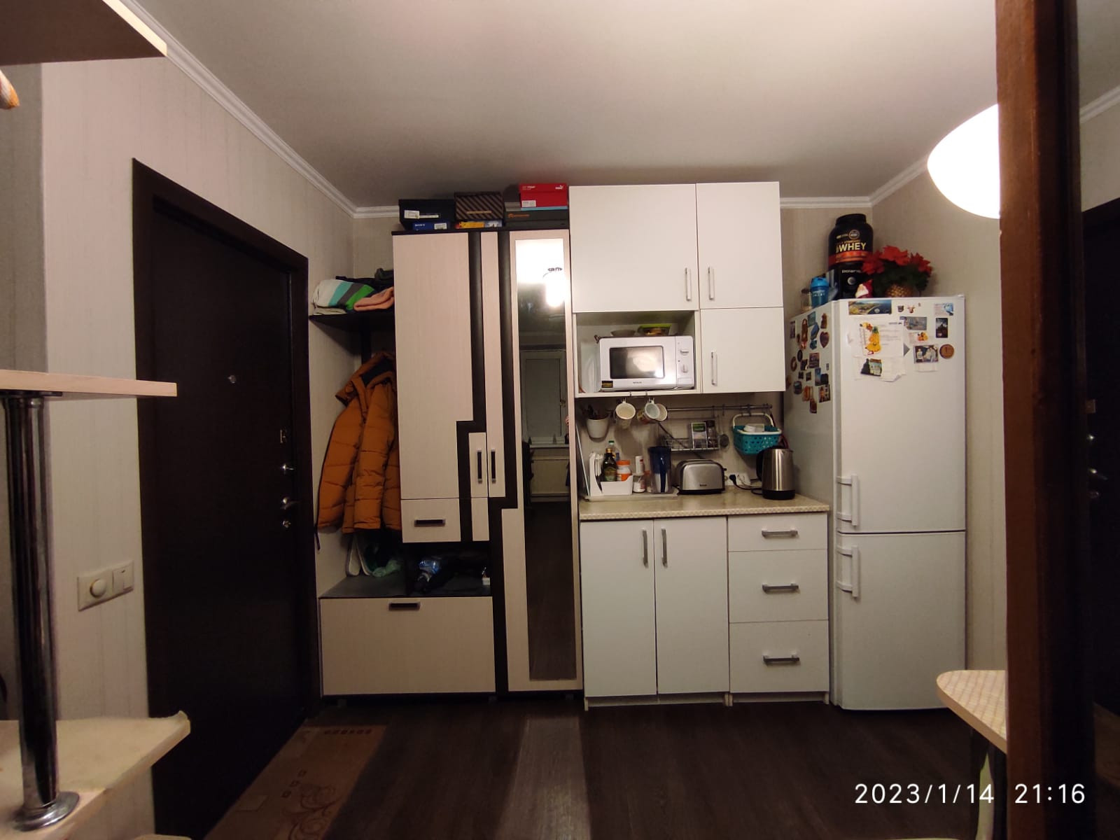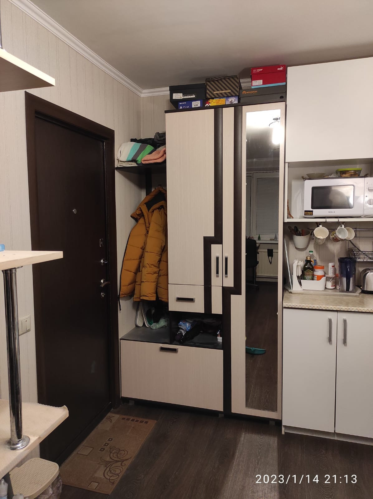 Много мест хранения: в коридоре у входа в комнату - шкаф с отсеками для хранения вещей и обуви, в комнате - 2 шкафа, + вместительный «пенал» в общем фойе внутри квартиры у входной двери.
