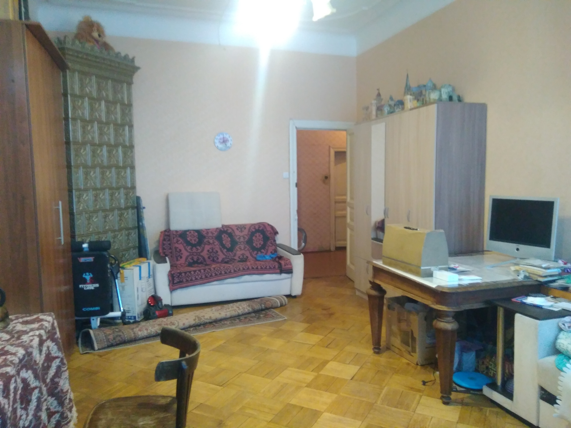 Три изолированные комнаты 25,9 кв.м, 14,6 кв.м, 10,2 кв.м. На долю в праве собственности приходится 72,61 кв.м общей площади квартиры. В местах общего пользования: на кухне четырёхконфорочная плита, три стола, кухонный шкаф, в ванной - шкаф, в квартире две кладовые, одна - полноценная комната с окном в ней выделено место под стол и холодильник. В хоз кладовке три полки типа антресолей под потолок. В комнате 25,6 м. сделан ремонт, есть изразцовая печь (можно топить, но при этом надо будет чистить дымоход в дальнейшем). Две комнаты - вид во двор, одна (25,6) на Овсяниковский сад. Есть чёрный ход с лифтом. Выходит во двор. Двор закрытый, по договорённости с соседями можно парковать машину. Рассмотрим разумный торг и/или вариант продажи только двух комнат.