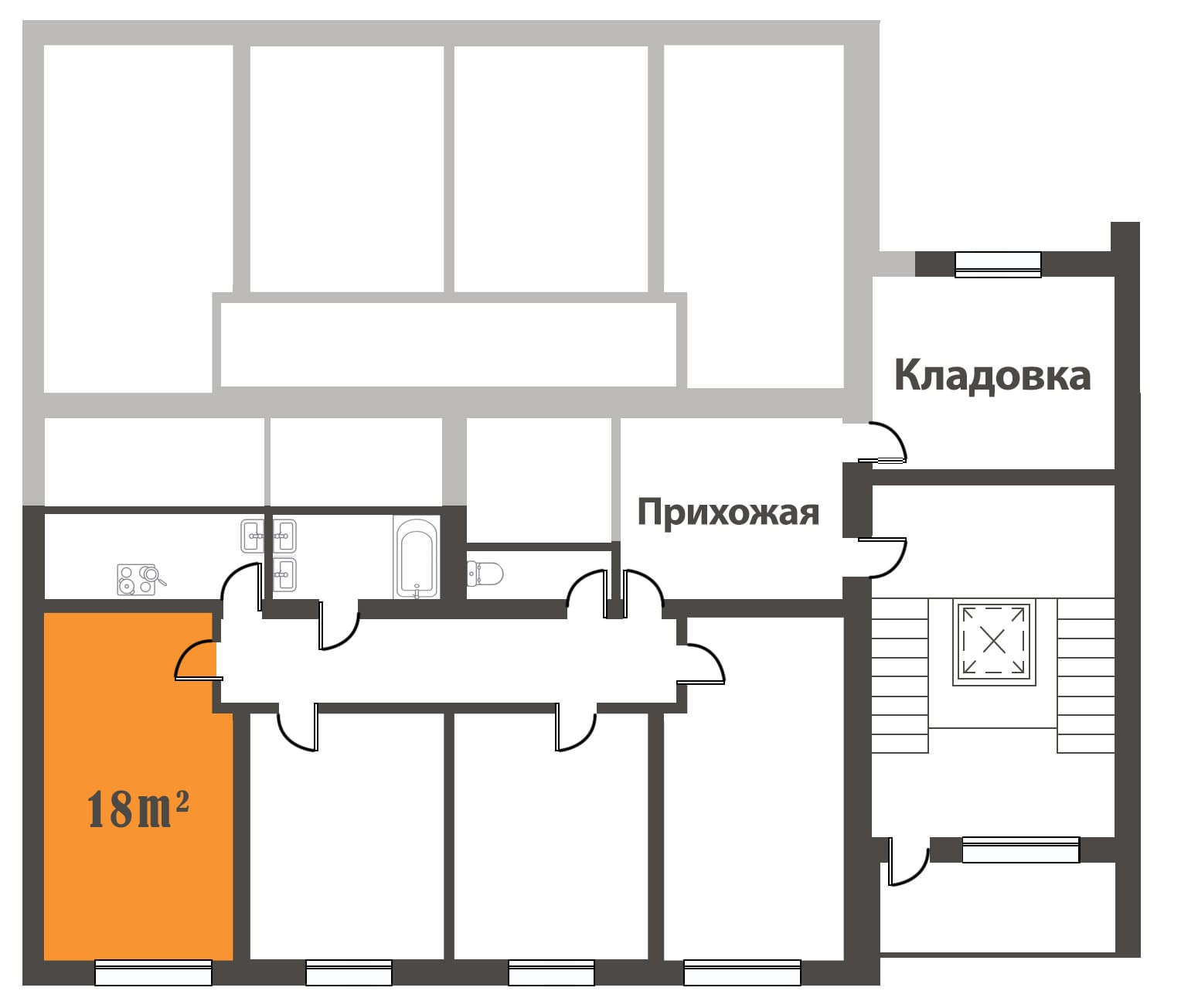 Квартира 8-ми комнатная, состоит из двух блоков по 4 комнаты. На четыре комнаты отдельная кухня - 6 м., коридор 12 м., ванная комната и туалет.