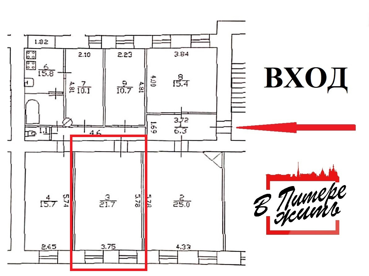 Продается комната в шестикомнатной квартире в Санкт-Петербурге в 5-ти минутах ходьбы от станции м.Площадь Восстания.
