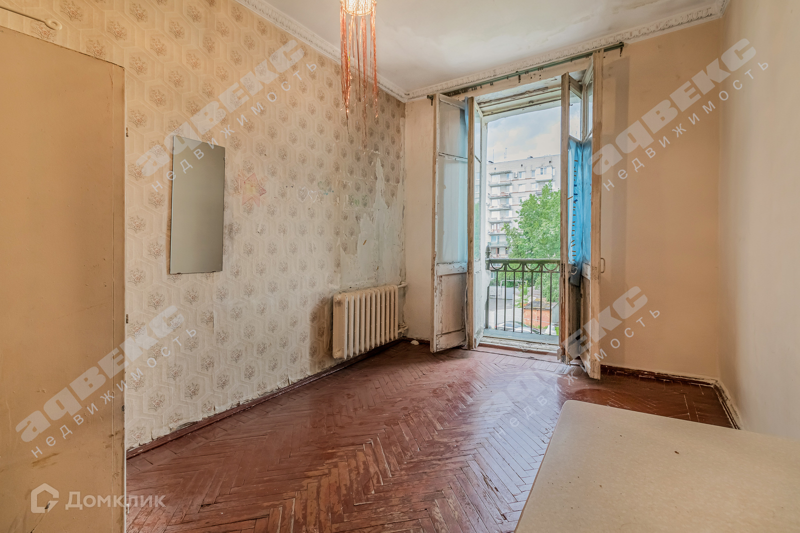 Светлая комната с балконом и высокими потолками.