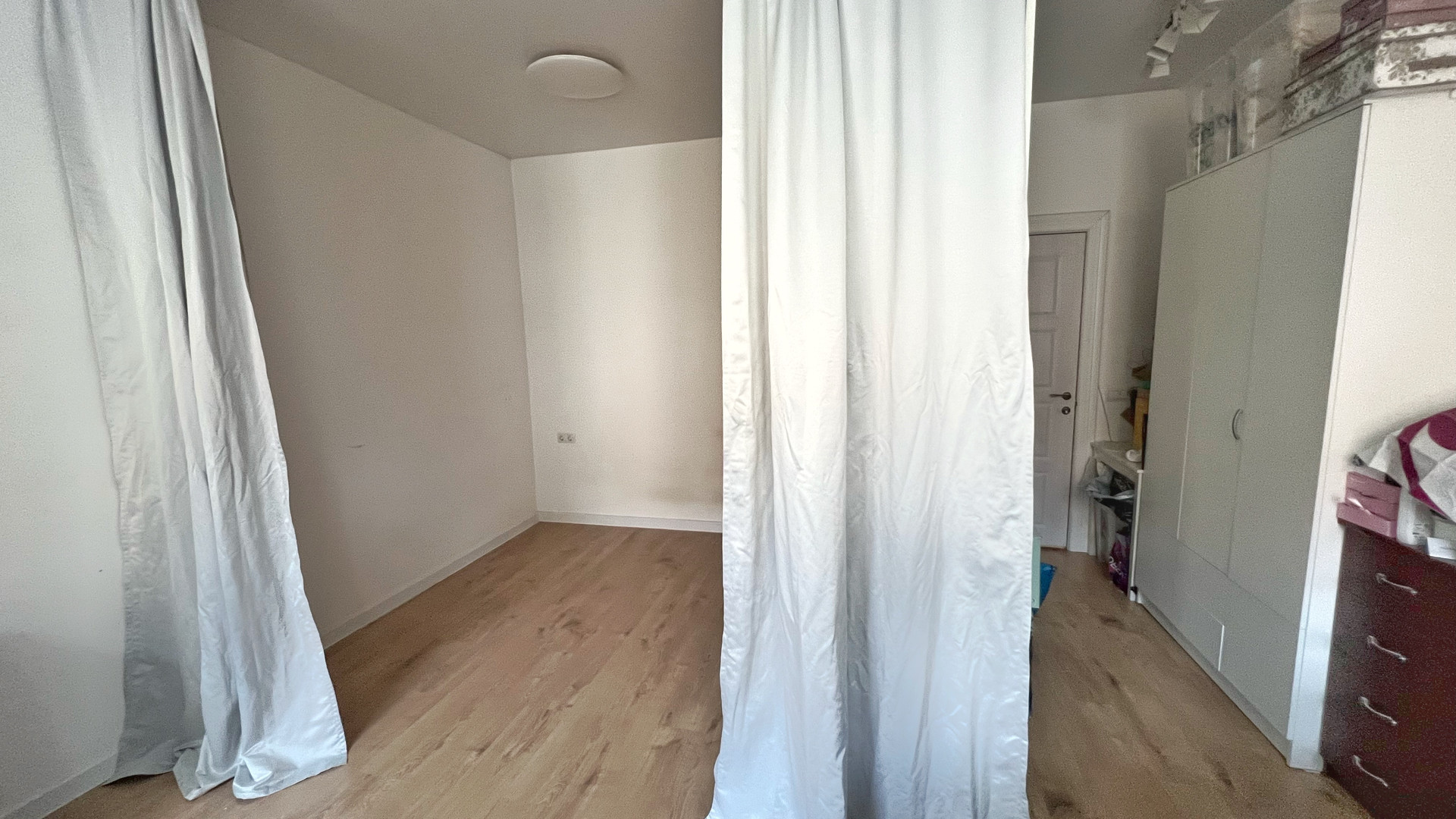 Сделано световое зонирование на 3 части: прихожая, гостиная, спальня. Посередине потолка установлен карниз во всю ширину комнаты — можно перемещать шторы и менять пространство по своему желанию.