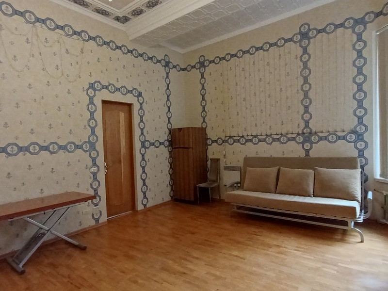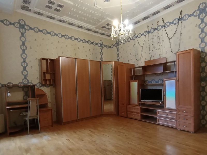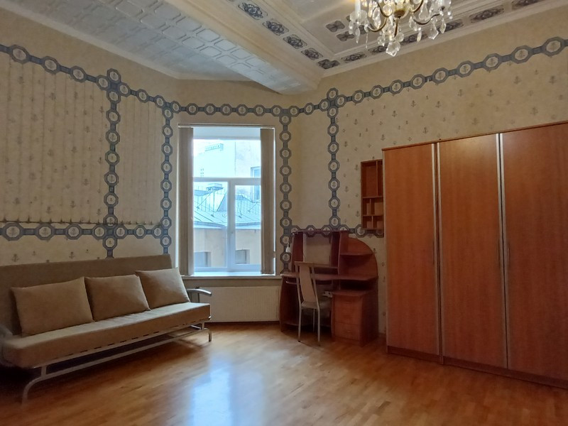 Квартира двухсторонняя. Общая площадь квартиры 142,7 кв.м, комнат 92,2 кв.м (29,6 наша +27,8+17,6+17,2). В комнате одно окно - выходит во двор. Комната чистая, теплая, высота потолка 3,85 м. Отопление центральное. На полу ламинат. Мебель в комнате остается покупателю в подарок. Кухня 17,9 кв.м. Есть свое место на кухне (раковина, стиральная машинка, газовая плита, кухонный гарнитур, антресоль). Санузел в кафеле - раздельный. Счетчики на воду и электричество.