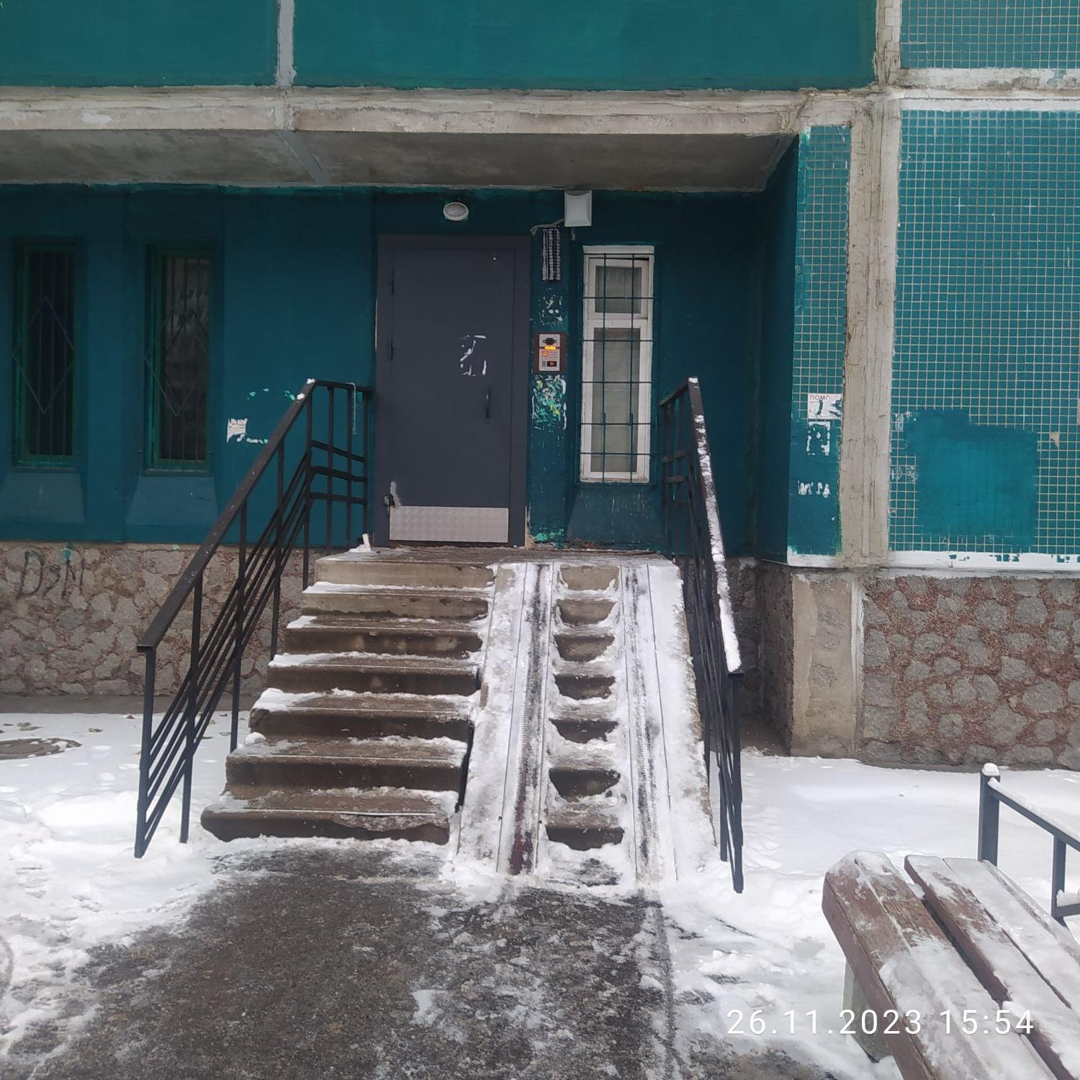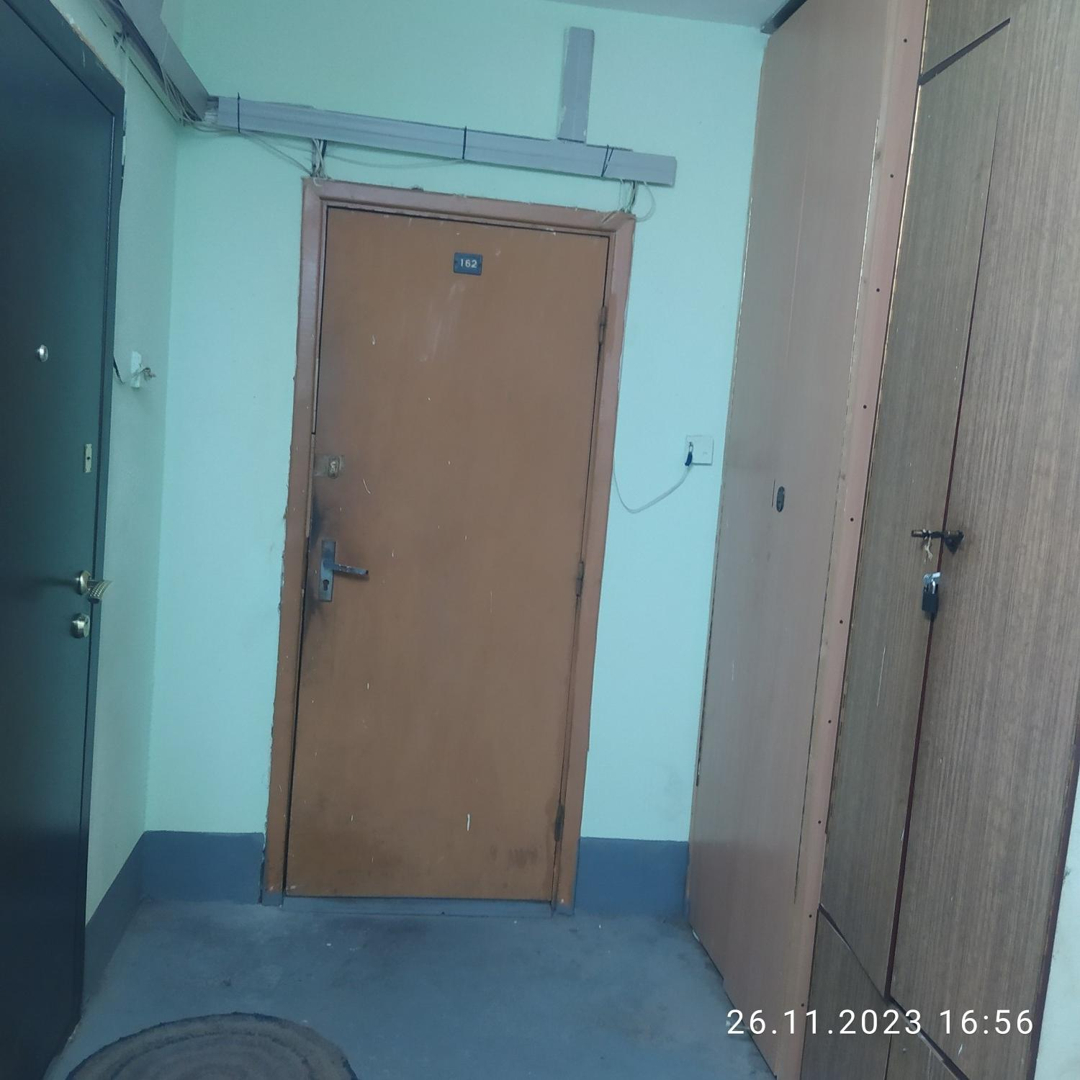 На лестничной площадке отделена часть коридора и установлена дверь на две квартиры, в имеющемся тамбуре установлен шкаф для хранения вещей.