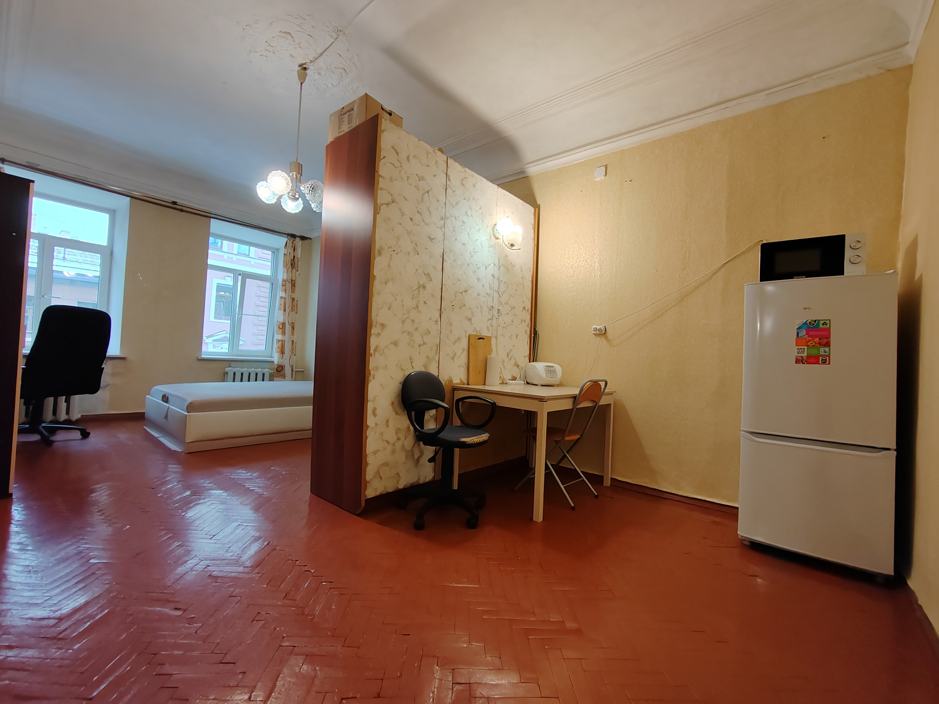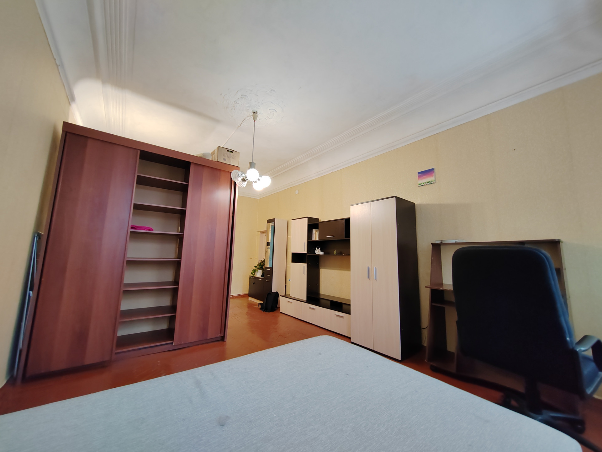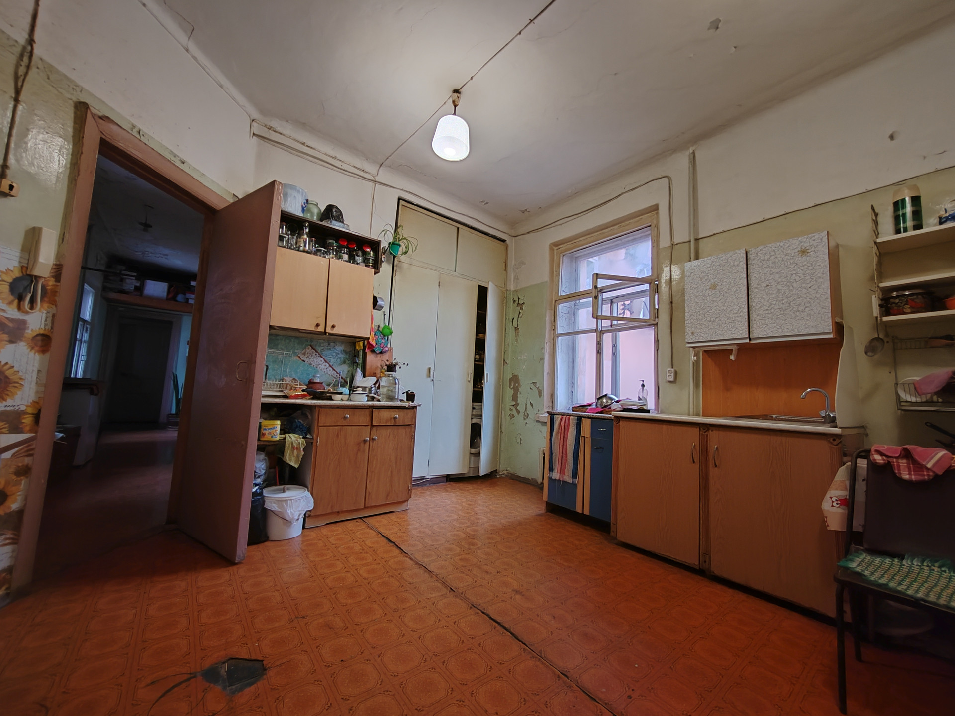 Комната теплая и чистая, сделан косметический ремонт. Общая площадь квартиры – 241 кв.м. Кухня – 21,1 кв.м. Комната – 24,1 кв.м. Санузел с душем раздельный – 7,5 и 7,6 кв.м. соответственно. Прихожая и коридор – 43,8 кв.м. Высота потолков 3,14 м.