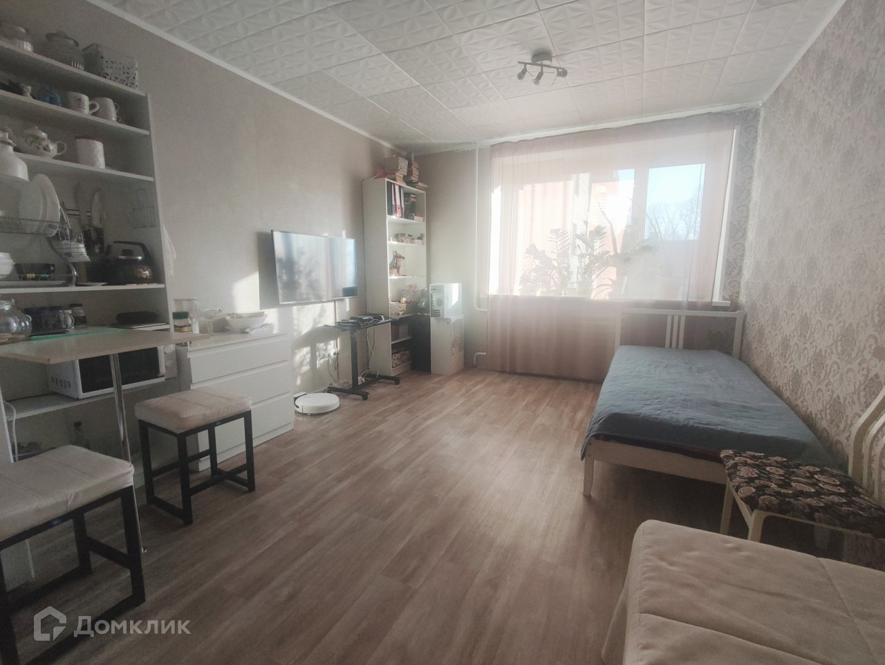 Окна выходят во двор. На кухне есть своё место с современным гарнитуром, мойка. Есть пожарный балкон, где сушат бельё. Преимуществом комнаты при приобретении является: две комнаты у одного собственника, которые в данный момент продаются , комната с одним соседом и ещё комната - не сдают и не проживают. Во дворе большая детская площадка, детский сад в 5-ти минутах ходьбы , места для парковки автомобилей.