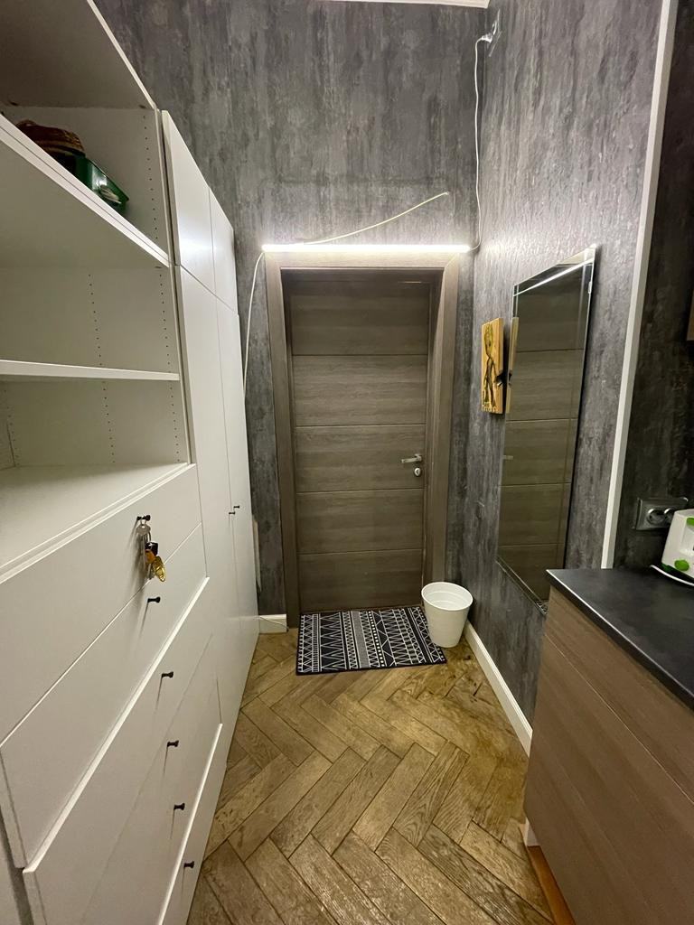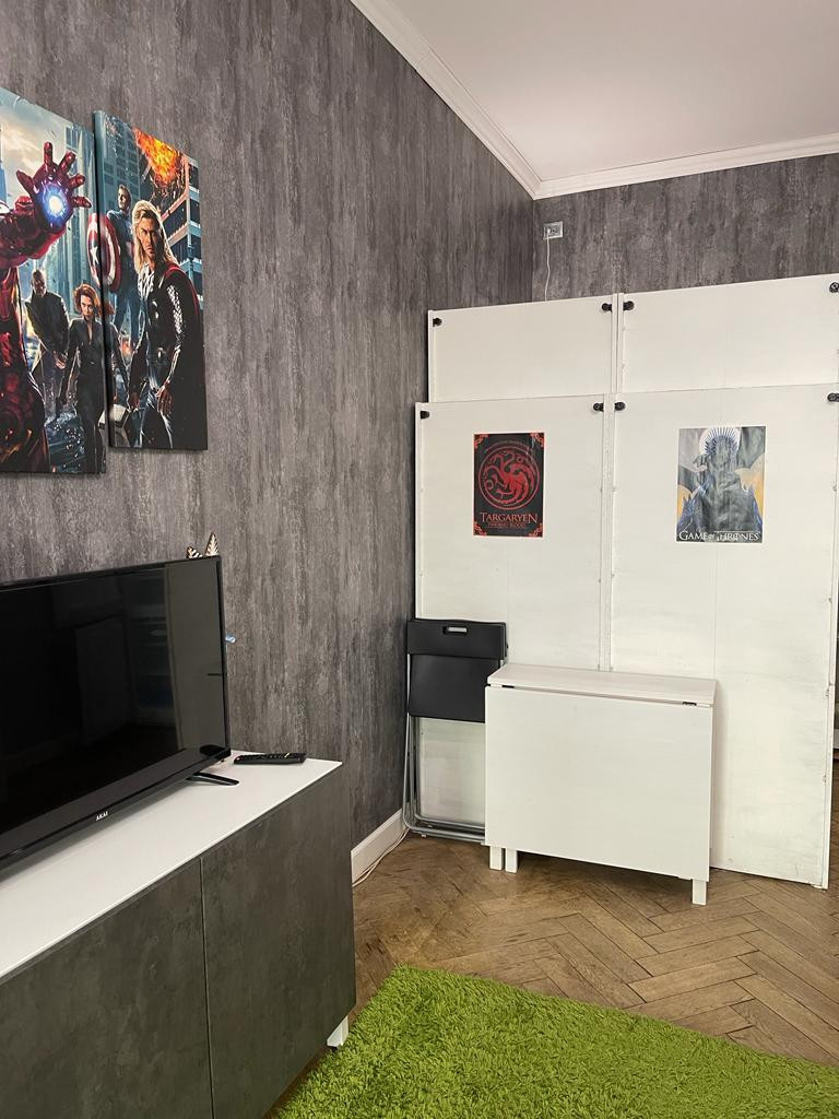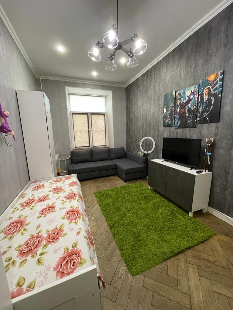Комната после косметического ремонта. В комнате зонированная зона. Окно в комнате выходит в тихий двор - колодец.