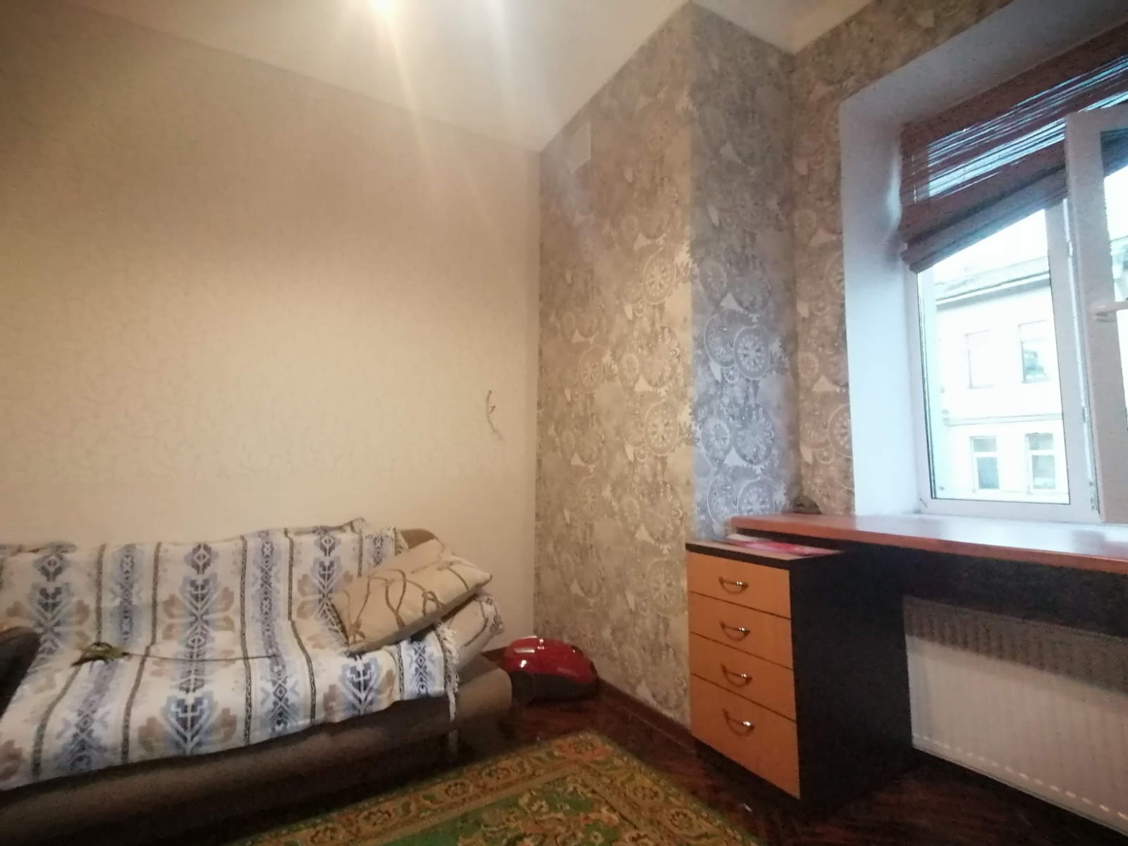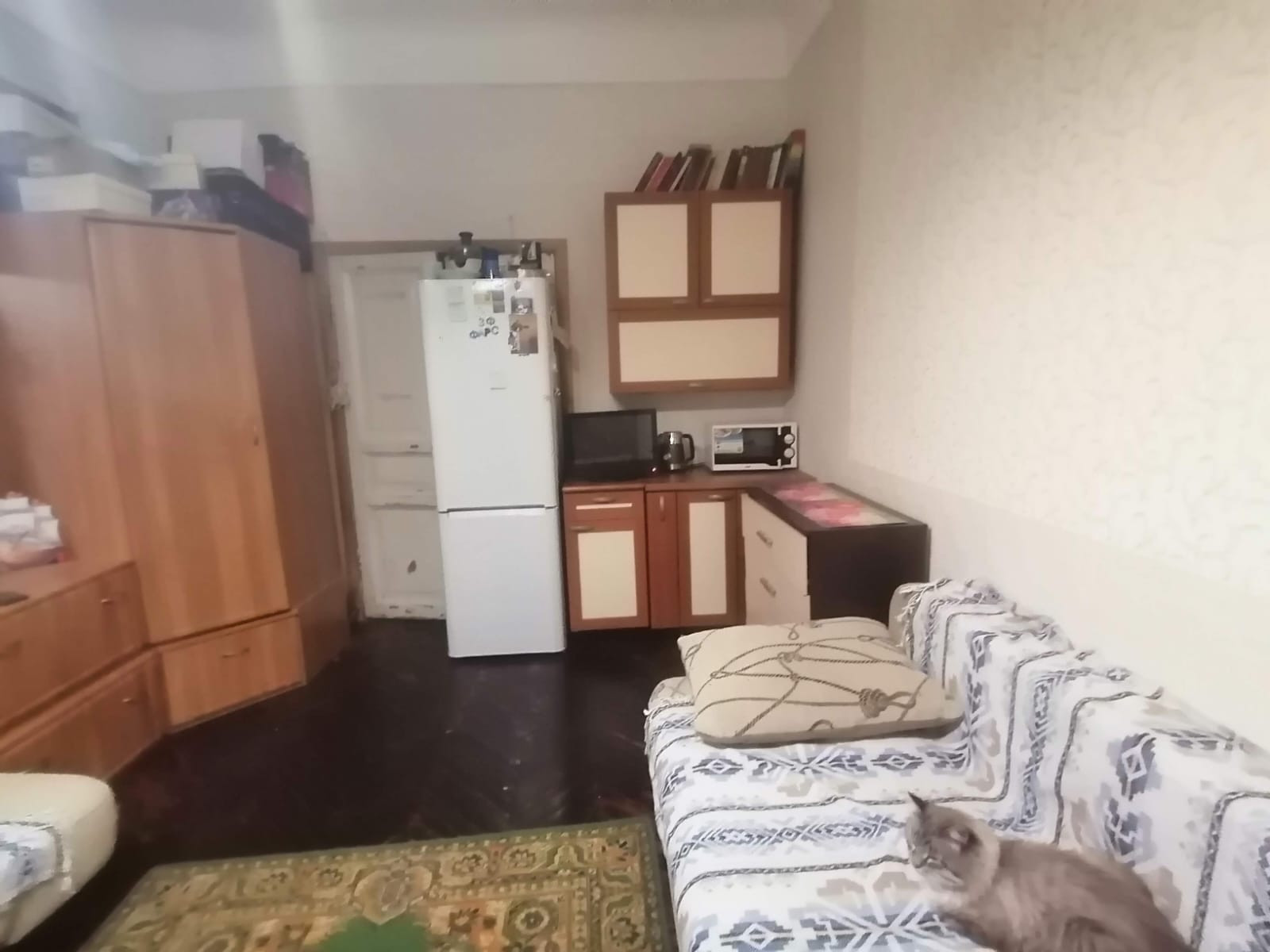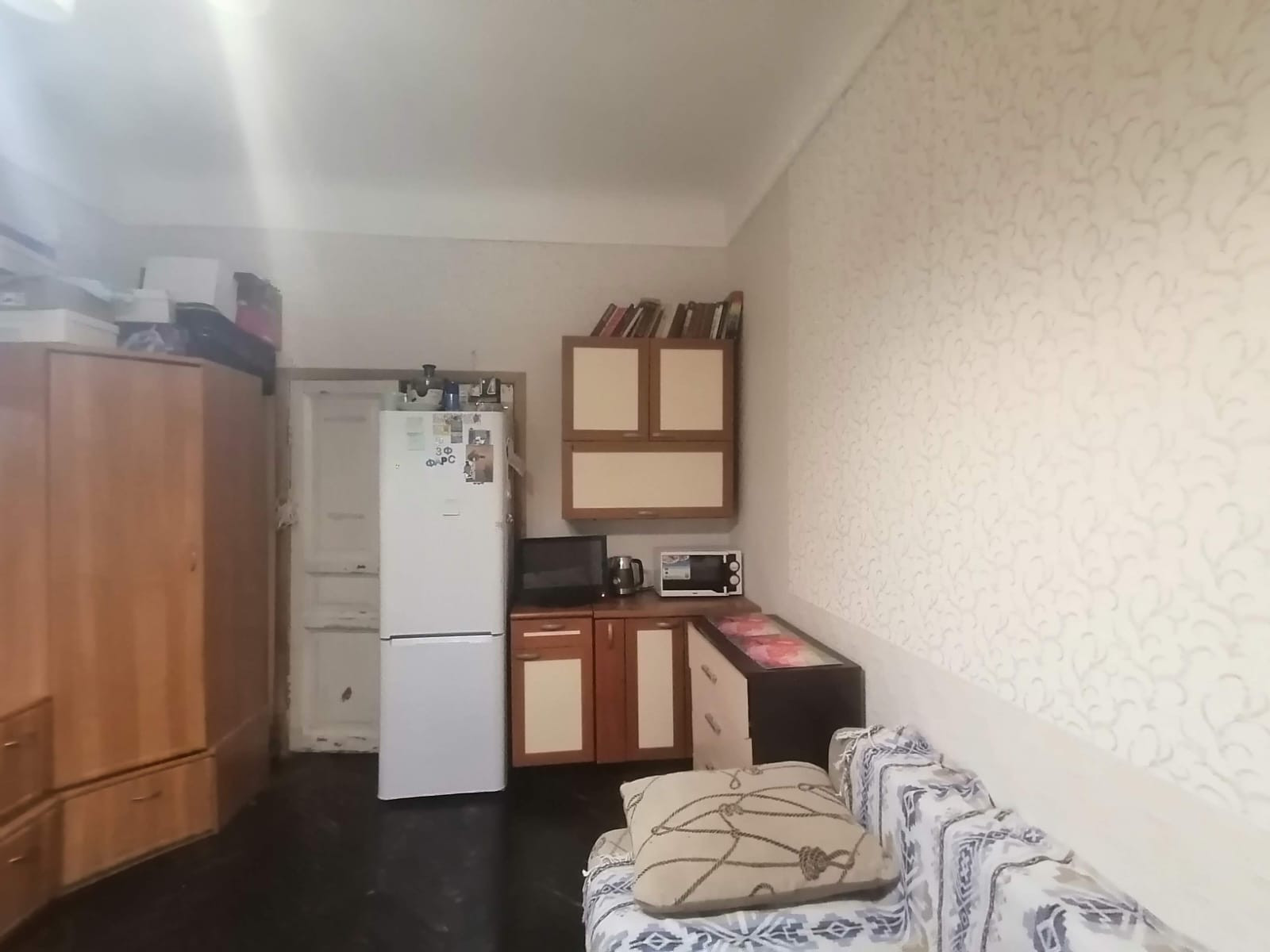 Комната эргономичной квадратной формы, площадью 17,5 кв.м. Сделан косметический ремонт. Пространство самой комнаты зонировано – имеется кухонное пространство, рабочая зона и зона для отдыха. На полу выложен паркет. Окно оборудовано тройным пластиковым стеклопакетом и выходит на улицу. В коридоре имеется дополнительное место для хранения вещей.