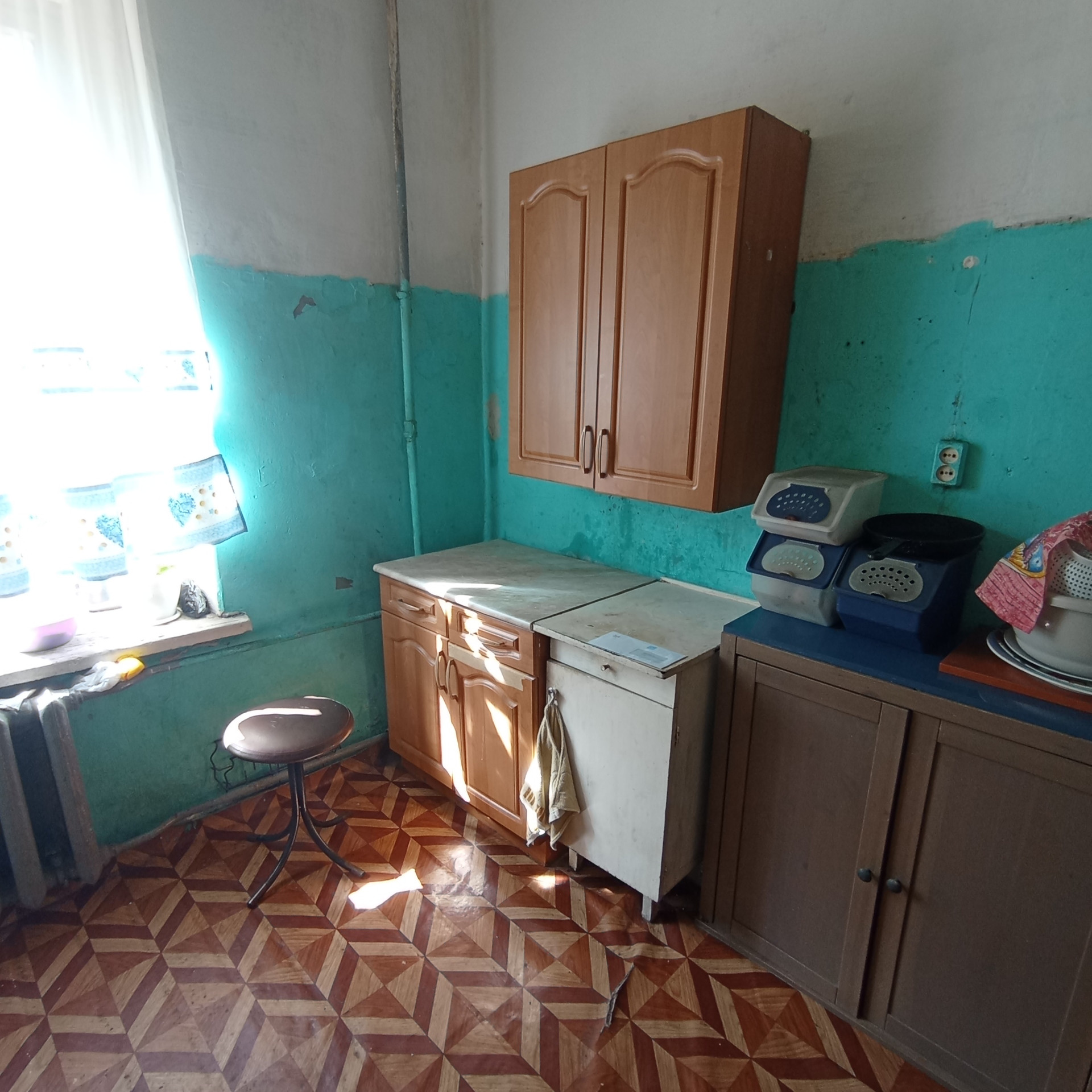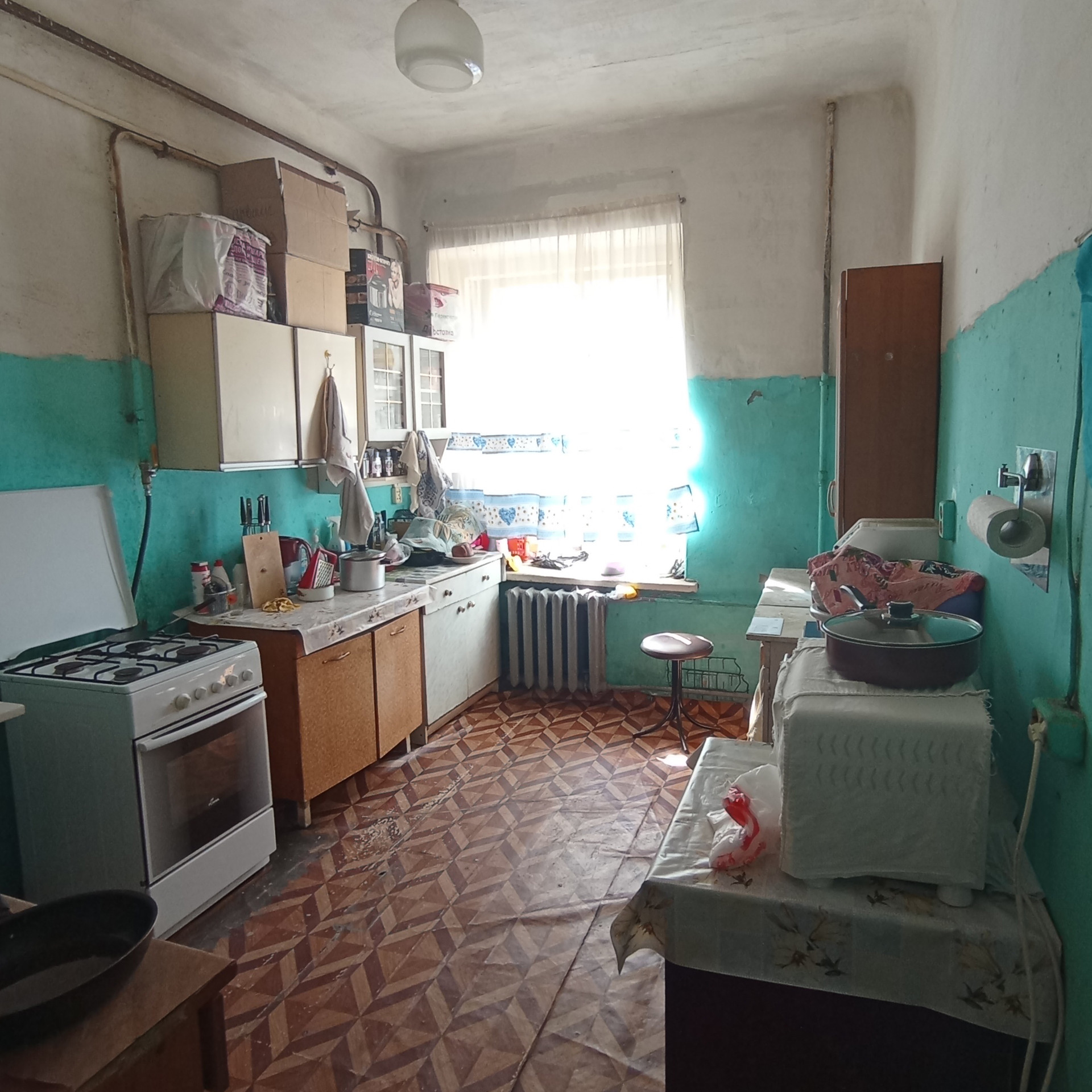 Стеклопакет в хорошем состоянии, на полу ламинат.