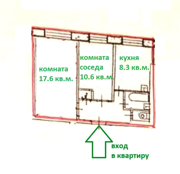 Соседняя комната (10.6 кв.м.) муниципальная, проживает один беcпроблемный мужчина (проживает более 20 лет).