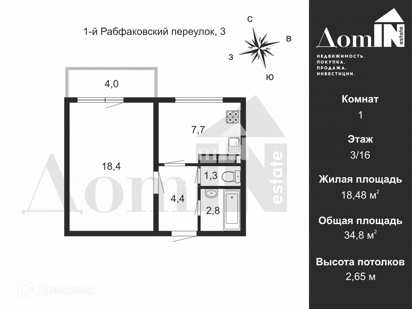 Общая площадь 34.5 м2