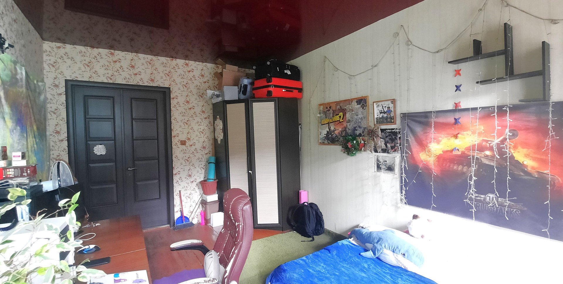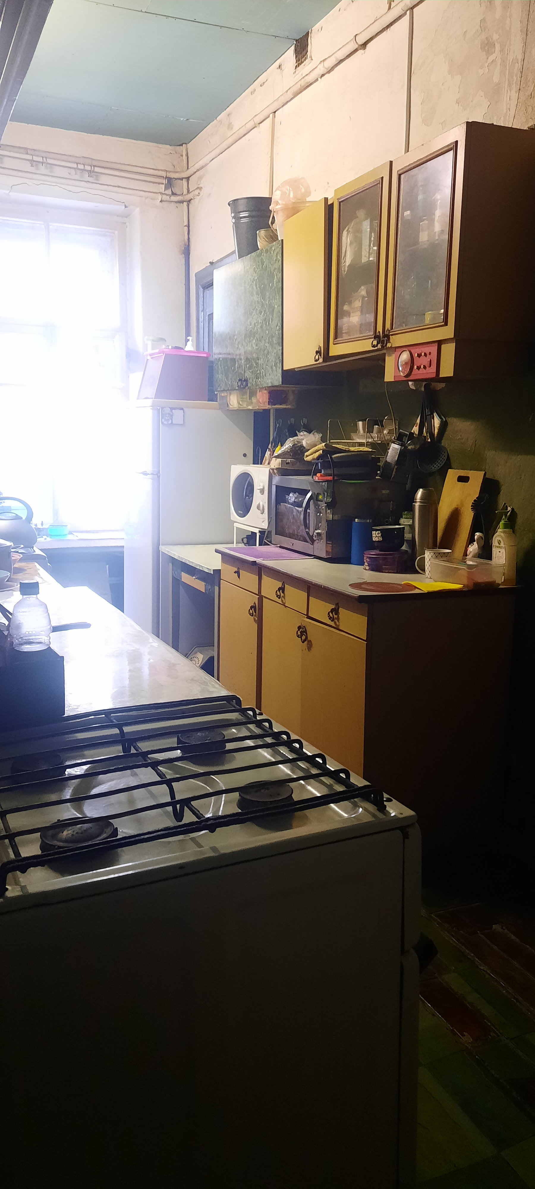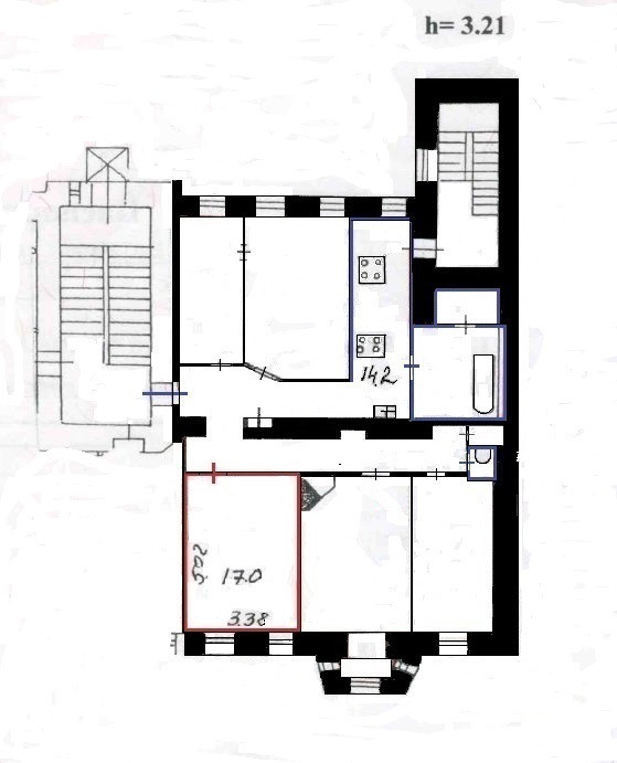 - Раздельный сан. узел с большой ванной комнатой ( 8 м.кв.), установлена стиральная машина. На кухне есть свое выделенное место, две плиты. В комнате установлены стеклопакеты, натяжной потолок.