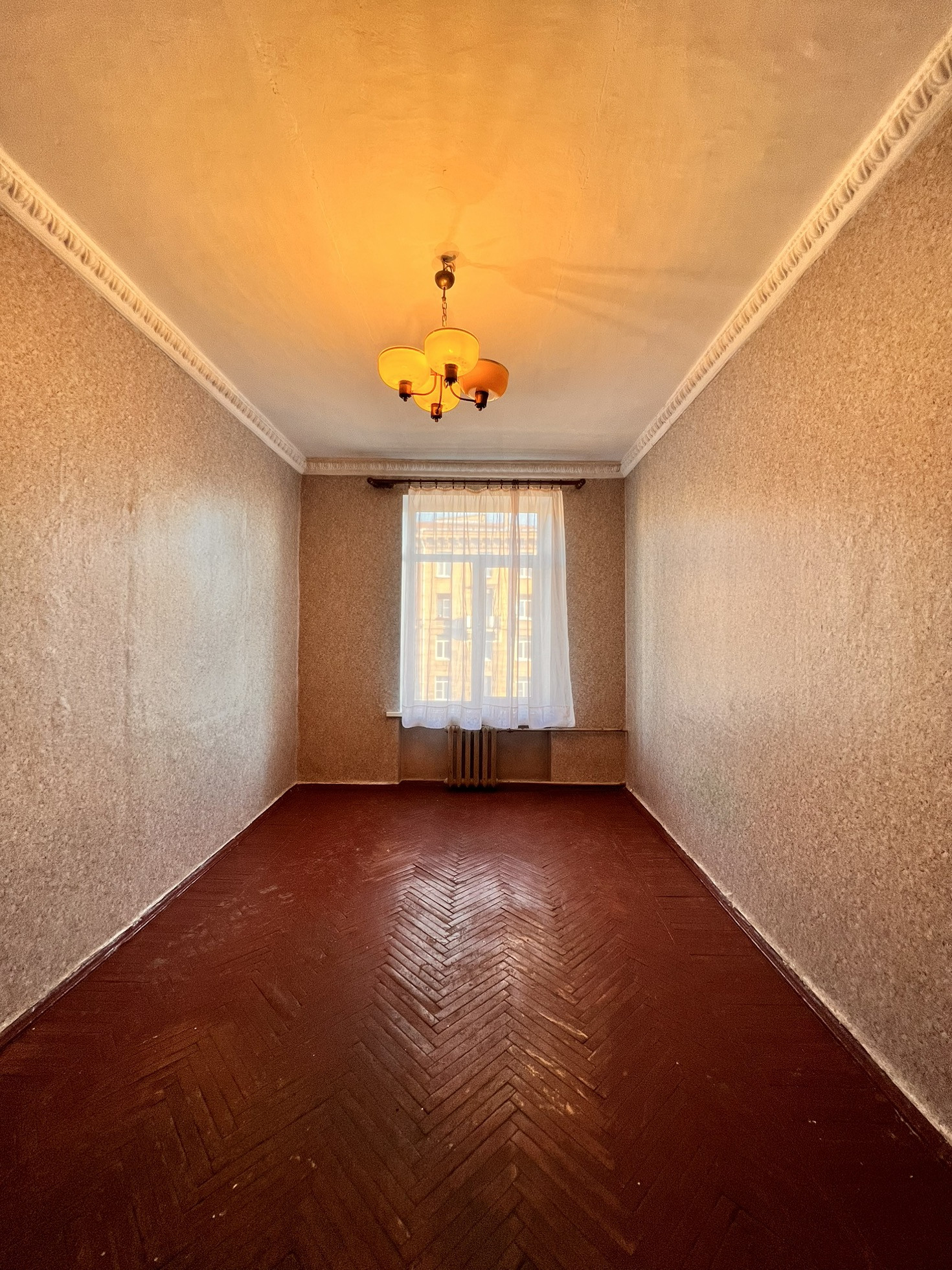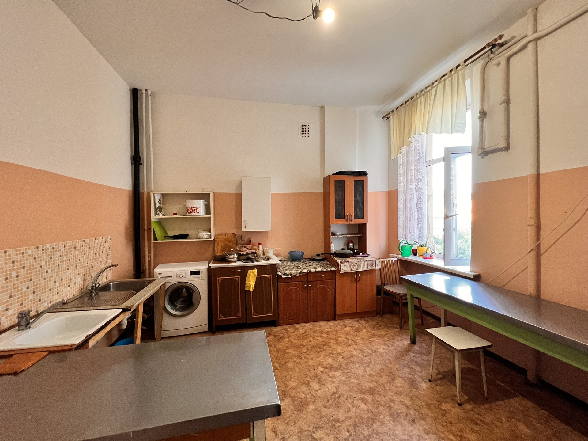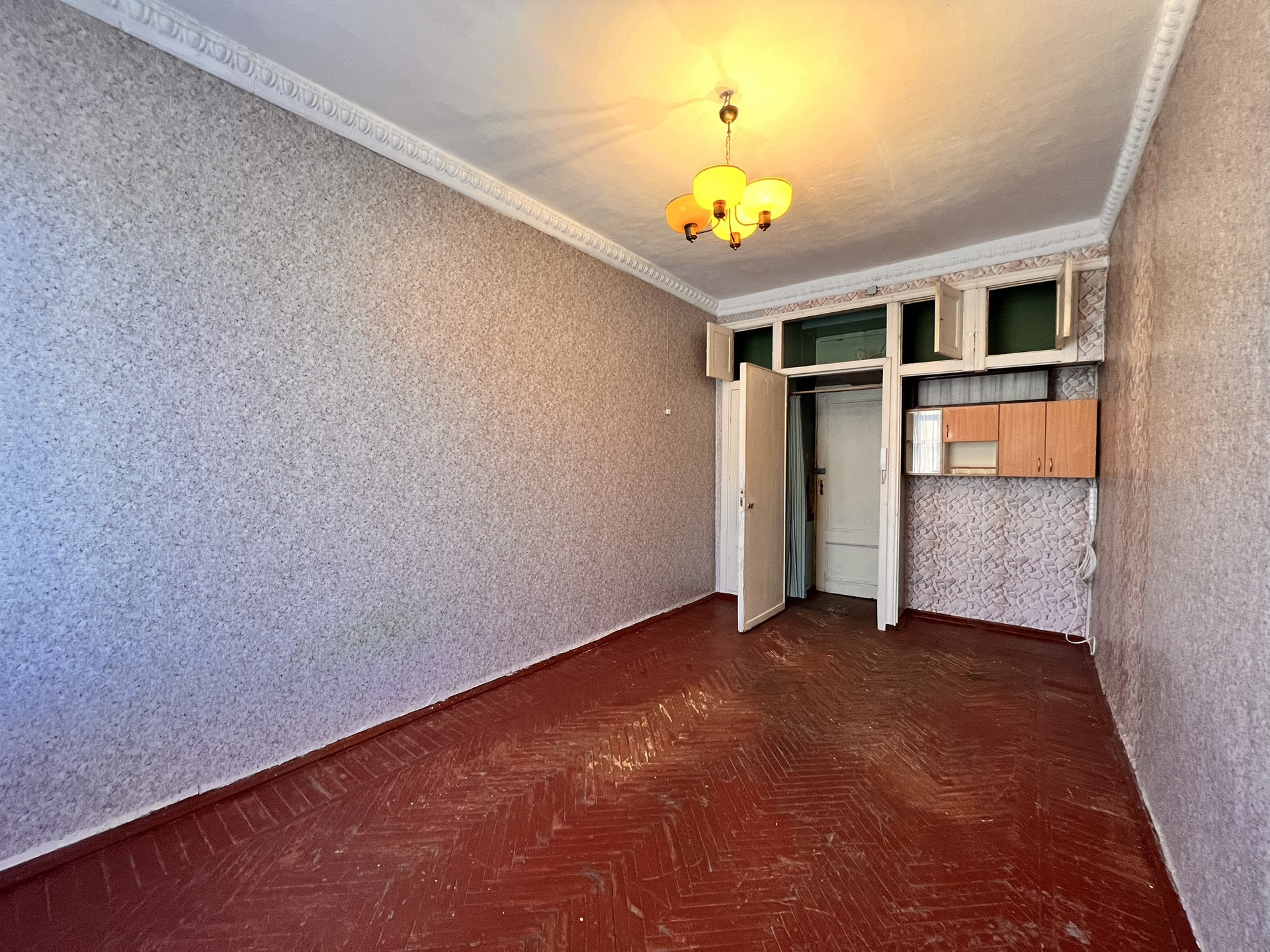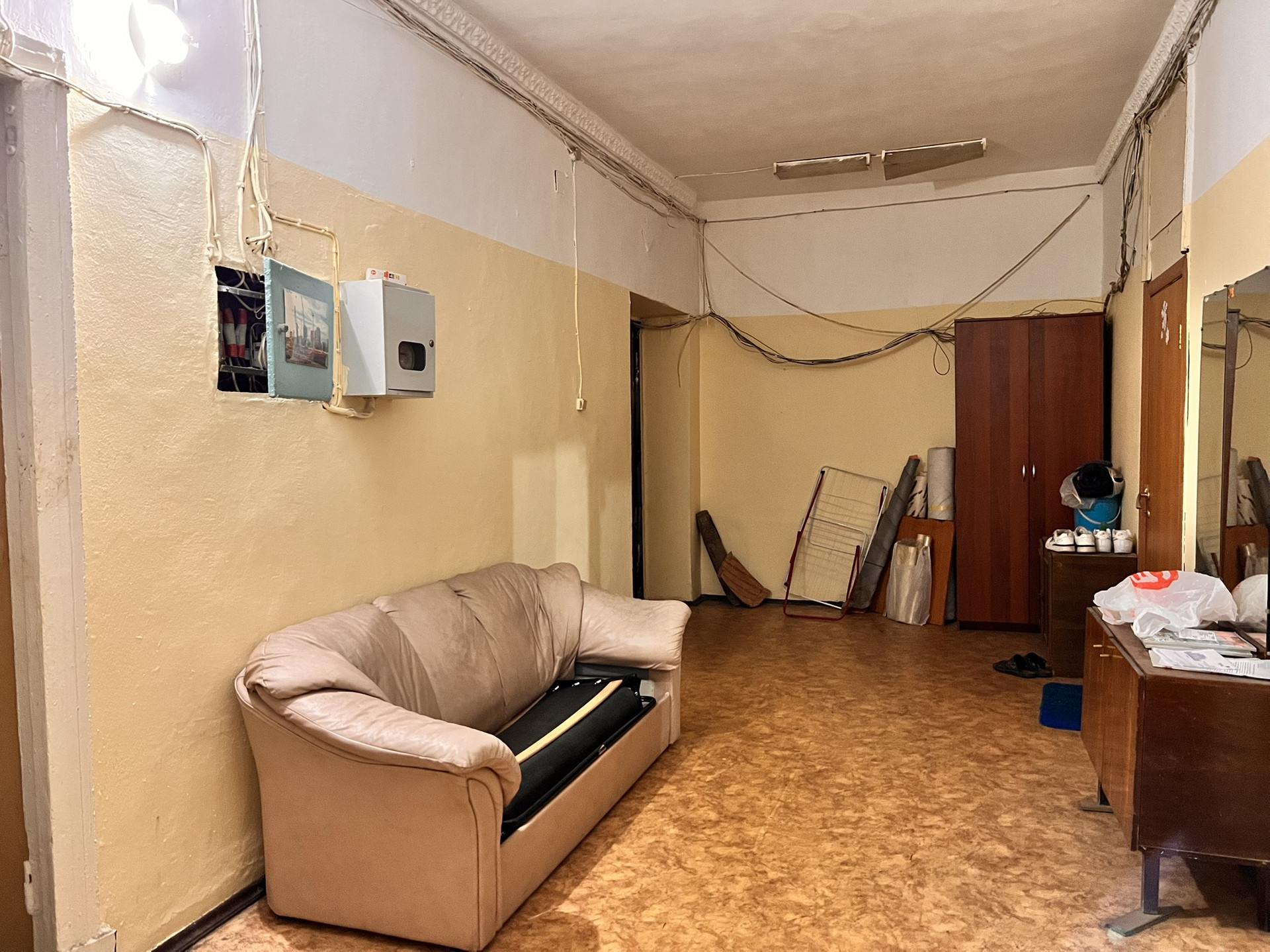 • Площадь комнаты 17,9 кв.м., высота потолка 3,2 м, можно возвести второй уровень для спального места.