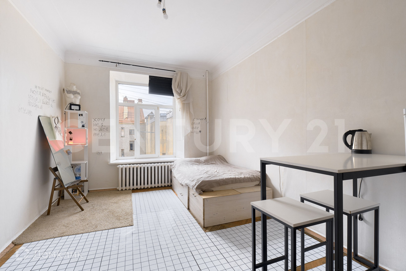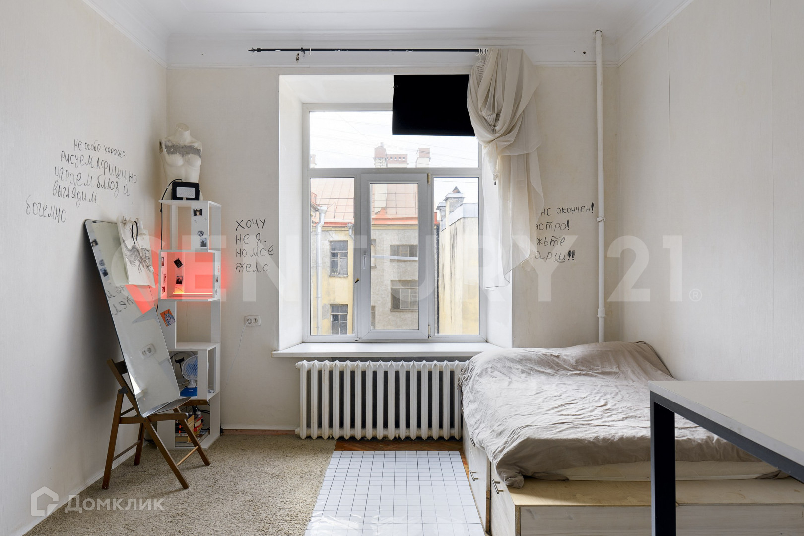 Окно комнаты выходит в тихий закрытый двор, нет шума от баров на рубинштейна