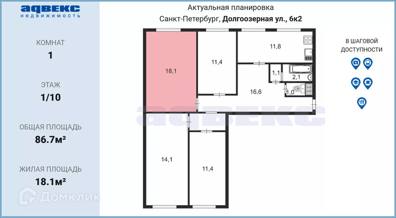 Комната, 86.7 м2, на продажу в Санкт-Петербурге, Долгоозёрная улица, 6к2