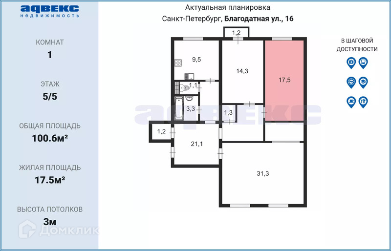 Комната, 100.6 м2, на продажу в Санкт-Петербурге, Благодатная улица, 16