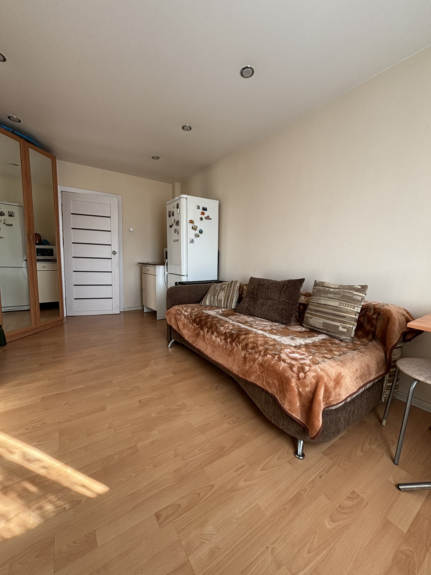 В комнате сделан ремонт, натяжные потолки, ламинат на полу.